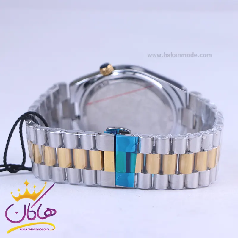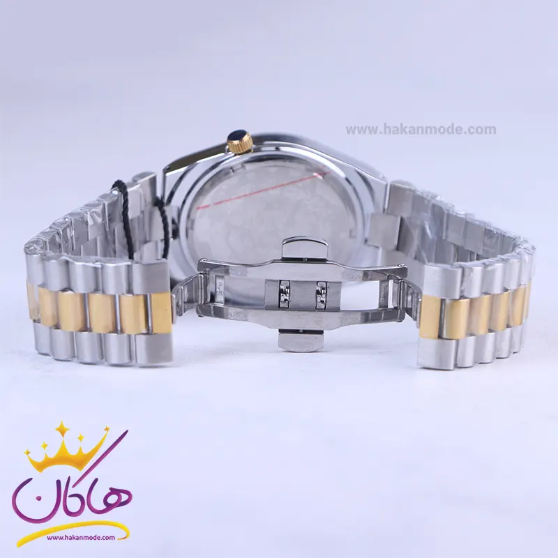 ساعت عقربهای سیتیزن مردانه فلزی نقرهای طلایی ظاهری کلاسیک و جذاب دارد. این ساعت استیل، رنگ ثابت و ضدحساسیت است. اصلیترین چیزی که در ساعت مردانه سیتیزن توجه ما را به خود جلب میکند، همخوانی رنگ بند با قاب طلایی آن است. اگر به درون صفحهی سورمهای رنگ ساعت نگاه کنید، اندکسها خطی و عقربهها طلایی و شبنما هستند. تقویم کنار عدد 3 قرار گرفته است و با شیشه ذره بینی که دارد کاملا خوانا و واضح است. اگر به صفحه ساعت دقت کنید، نام برند سیتیزن زیر ساعت 12 دیده میشود. در کنار صفحه یک پیچ کوک برای تنظیم زمان وجود دارد. بند ساعت، فلزی و از نوع استیل مرغوب است که باعث تعرق و خارش نمیشود. طرح این بند از یک بافت یکدست تشکیل شده که قسمت میانی آن طلایی و کنارههای آن نقرهای رنگ است. قفل آن از مدل پروانهای دکمهدار است که از دسته قفلهای محکم و مطمئن است.