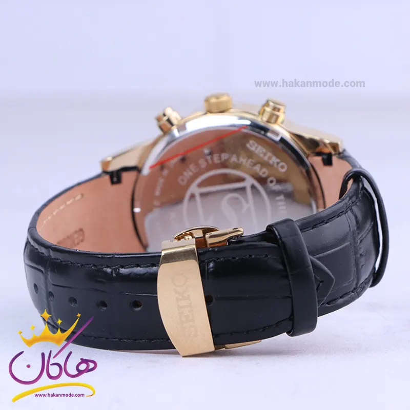ساعت سیکو مردانه بند چرم مشکی ظاهری کلاسیک و جذاب دارد. قاب ساعت استیل طلایی، رنگ ثابت و ضدحساسیت است. علاوه بر ویژگیهای ظاهری اگر به داخل ساعت نگاه کنید، سه صفحهی دایرهای کوچک میبینید که هر کدام نشان دهندهی پارامتری خاص هستند. یک صفحه نشانگر ثانیه شمار است. دایرهی سمت چپی تایم دقیقه کرنوگراف را نشان میدهد و دایرهی بالایی، زمان را به صورت 24 ساعت نشان میدهد. داشتن اندکسهای خطی و عقربههای شب رنگ به شما این امکان را میدهد که در شب و محیطهای کم نور هم گذر زمان را ببینید. یک مربع کوچک کنار عدد 3 و یک سری عدد دور تا دور این صفحههای کوچک وجود دارد که نشاندهندهی تقویم ساعت است. در کنار این ساعت بند چرم یک پین (دسته کوک) و دو دکمه قرار دارد که پین برای تنظیم تقویم و ساعت است. قفل این ساعت از نوع پروانهای دکمهدار است و ساعت به راحتی از دست نمیافتد. اگر به درون صفحه مشکی ساعت نگاه کنید، نام برند سیکو کنار ساعت 3 دیده میشود. بند ساعت از نوع چرم مرغوب که پوسته پوسته و بریده نمیشود. این بند باعث تعرق و خارش نمیشود.
