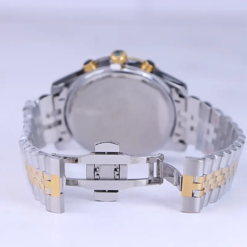 ساعت مچی مردانه فلزی سیکو ظاهری مدرن و جذاب دارد. این ساعت استیل نقرهای طلایی، رنگ ثابت و ضدحساسیت است. در واقع این ساعت، طرح سه موتوره است و صفحات کوچکی که میبینید، نمایشی هستند. اگر به درون صفحه مشکی رنگ ساعت نگاه کنید، اندکسهای ساعت به صورت خطی و عقربهها شبنما طراحی شدهاند. یک مربع کوچک بین اعداد 4 و 5 قرار دارد که تقویم ساعت است. نام برند Seiko زیر ساعت 12 دیده میشود. در کنار صفحه یک پیچ کوک و دو دکمه برای تنظیم زمان وجود دارد. بند ساعت، فلزی و از نوع استیل مرغوب است که باعث تعرق و خارش نمیشود. طرح این بند از یک بافت ریز و درشت تشکیل شده و که قسمت میانی طلایی و کنارههای آن نقرهای رنگ است و قفل آن از مدل پروانه ای دکمهدار است که از دسته قفلهای محکم و مطمئن است.