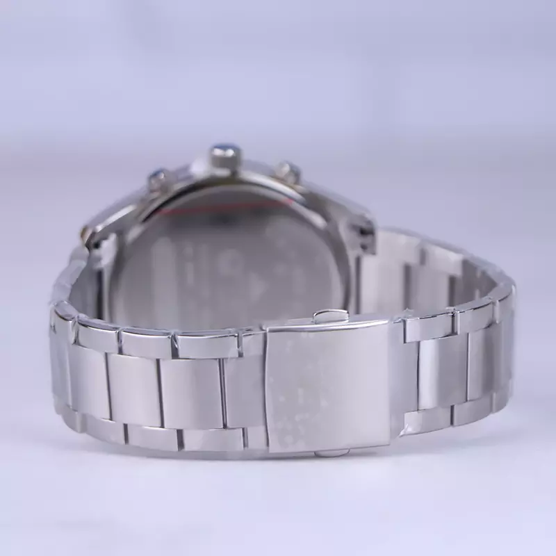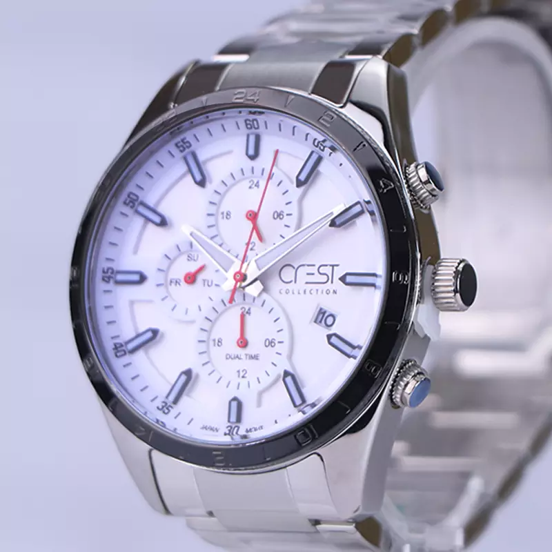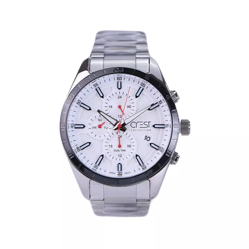 ساعت عقربه ای کرست مردانه فلزی ظاهری مدرن و جذاب دارد. این ساعت بند استیل نقرهای، رنگ ثابت و ضدحساسیت است. قاب دور صفحه ساعت مشکی رنگ است که یک سری اعداد روی آن دیده میشود. اصلیترین چیزی که در ساعت مردانه کرست توجه ما را به خود جلب میکند، سه صفحه دایرهای کوچک است، که درون صفحه هستند. دایرههای موجود در صفحهی سفید رنگ این ساعت، هر کدام نشان دهندهی پارامتری خاص هستند. یک صفحه ساعت را به صورت ۲۴ ساعت نشان میدهد. گزینه بعدی روزهای هفته را نشان میدهد. دایرهی بعدی نشان دهندهی ساعت جهانی است. در سمت راست یک مربع کوچک وجود دارد که نشانگر روزهای ماه بوده و همان تقویم ساعت نیز است. عقربهها نقرهای، شبنما و اندکسها خطی و شبنما هستند. ثانیه شمار این ساعت قرمز رنگ طراحی شده است. اگر به درون صفحه نگاه کنید، نام برند crest کنار ساعت 3 دیده میشود. در کنار صفحه یک پیچ کوک و دو دکمه برای تنظیم زمان وجود دارد. بند ساعت، فلزی و از نوع استیل مرغوب است که باعث تعرق و خارش نمیشود. طرح این بند از یک بافت یکدست تشکیل شده است و قفل آن از مدل دوتکه دکمهدار است که از دسته قفلهای محکم و مطمئن است.