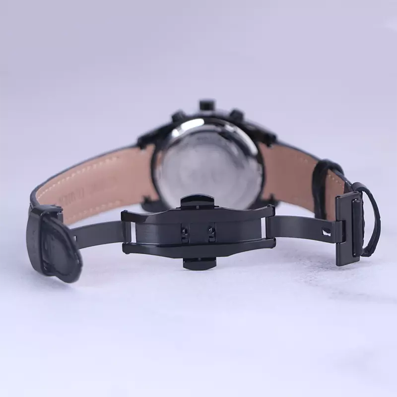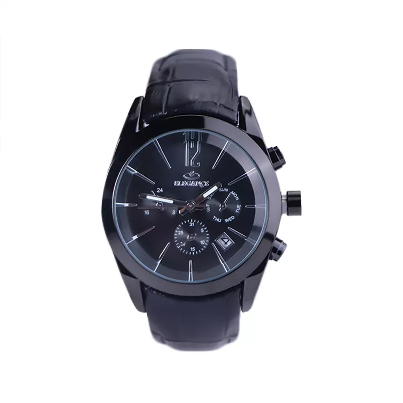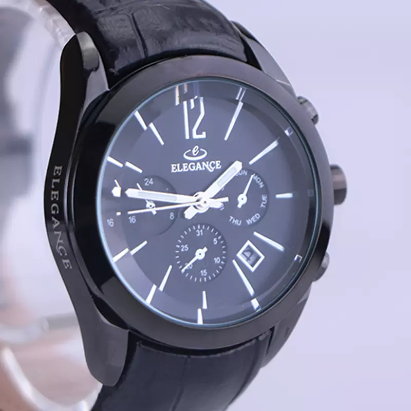ساعت الگانس زنانه بند چرم مشکی ظاهری مدرن و جذاب دارد. قاب این ساعت به رنگ استیل مشکی، رنگ ثابت و ضدحساسیت است. در واقع این ساعت، طرح سه موتوره است و صفحات کوچکی که می‌بینید، نمایشی هستند. داشتن اندکس‌های خطی نقره‌ای و عقربه‌‌های شب رنگ به شما این امکان را می‌دهد که در شب و محیط‌های کم نور هم گذر زمان را ببینید. اگر به درون صفحه مشکی رنگ ساعت نگاه کنید، نام برند ELEGANCE زیر ساعت 12 قرار دارد. یک مربع کوچک کنار عدد 4 قرار دارد که تقویم ساعت است. بند ساعت از نوع چرم مرغوب است که پوسته پوسته و بریده نمی‌شود، همچنین باعث تعرق و خارش نمی‌شود. قفل این ساعت از مدل پروانه‌ای دکمه‌دار است و ساعت به راحتی از دست نمی‌افتد. این مدل قفل، مثل قفل کمربندی روی بند ترک یا بریدگی ایجاد نمی‌کند و از محبوبترین قفل‌ها است.