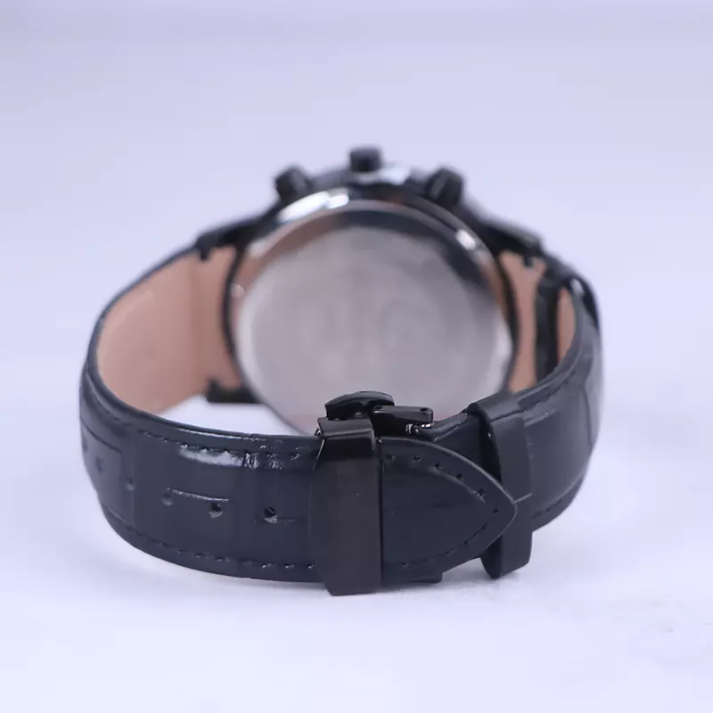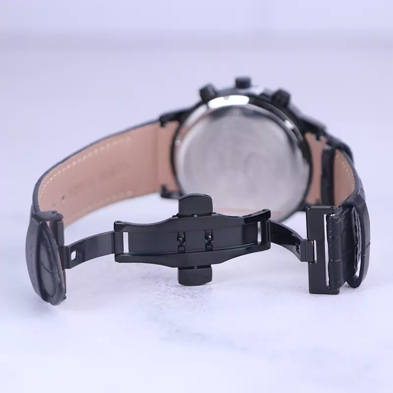 ساعت الگانس مردانه بند چرم مشکی ظاهری مدرن و جذاب دارد. قاب این ساعت گرد و به رنگ استیل مشکی، رنگ ثابت و ضدحساسیت است. در واقع این ساعت، طرح سه موتوره است و صفحات کوچکی که می‌بینید، نمایشی هستند. اگر به درون صفحه مشکی رنگ ساعت نگاه کنید، نام برند ELEGANCE کنار ساعت 3 دیده می‌شود. یک مربع کوچک بین اعداد 4 و 5 قرار دارد که همان تقویم ساعت است. داشتن اندکس‌های خطی رزگلد و عقربه‌ های شب رنگ به شما این امکان را می‌دهد که در شب و محیط‌های کم نور هم گذر زمان را ببینید. بند ساعت از نوع چرم مرغوب است که پوسته پوسته و بریده نمی‌شود، همچنین باعث تعرق و خارش نمی‌شود. قفل این ساعت از مدل پروانه‌ای دکمه‌دار است و ساعت به راحتی از دست نمی‌افتد. این مدل قفل، مثل قفل کمربندی روی بند ترک یا بریدگی ایجاد نمی‌کند و از محبوبترین قفل‌ها است.