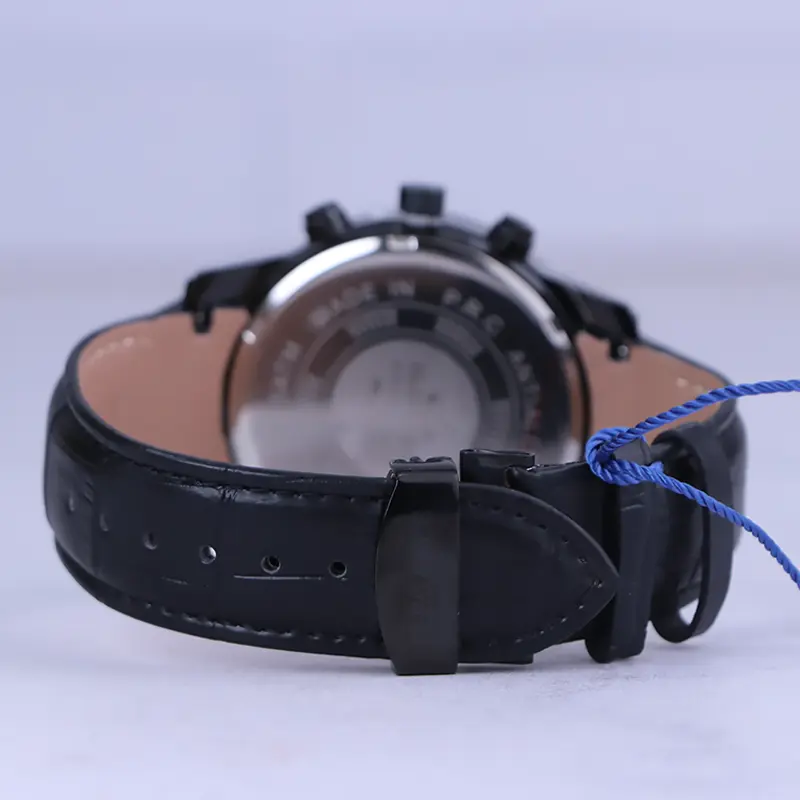 ساعت الگانس مردانه بند چرم مشکی ظاهری مدرن و جذاب دارد. قاب این ساعت به رنگ استیل مشکی، رنگ ثابت و ضدحساسیت است. در واقع این ساعت، طرح سه موتوره است و صفحات کوچکی که میبینید، نمایشی هستند. داشتن اندکسهای خطی رزگلد و عقربههای شب رنگ به شما این امکان را میدهد که در شب و محیطهای کم نور هم گذر زمان را ببینید. اگر به درون صفحه مشکی ساعت نگاه کنید، نام برند ELEGANCE زیر ساعت 12 قرار دارد. یک مربع کوچک بین اعداد 4 و 5 قرار دارد که تقویم ساعت است. بند ساعت از نوع چرم مرغوب است که پوسته پوسته و بریده نمیشود، همچنین باعث تعرق و خارش نمیشود. قفل این ساعت از مدل پروانهای دکمهدار است و ساعت به راحتی از دست نمیافتد. این مدل قفل، مثل قفل کمربندی روی بند ترک یا بریدگی ایجاد نمیکند و از محبوبترین قفلها است.