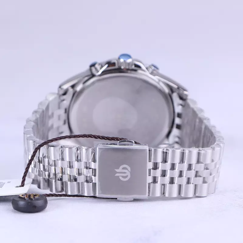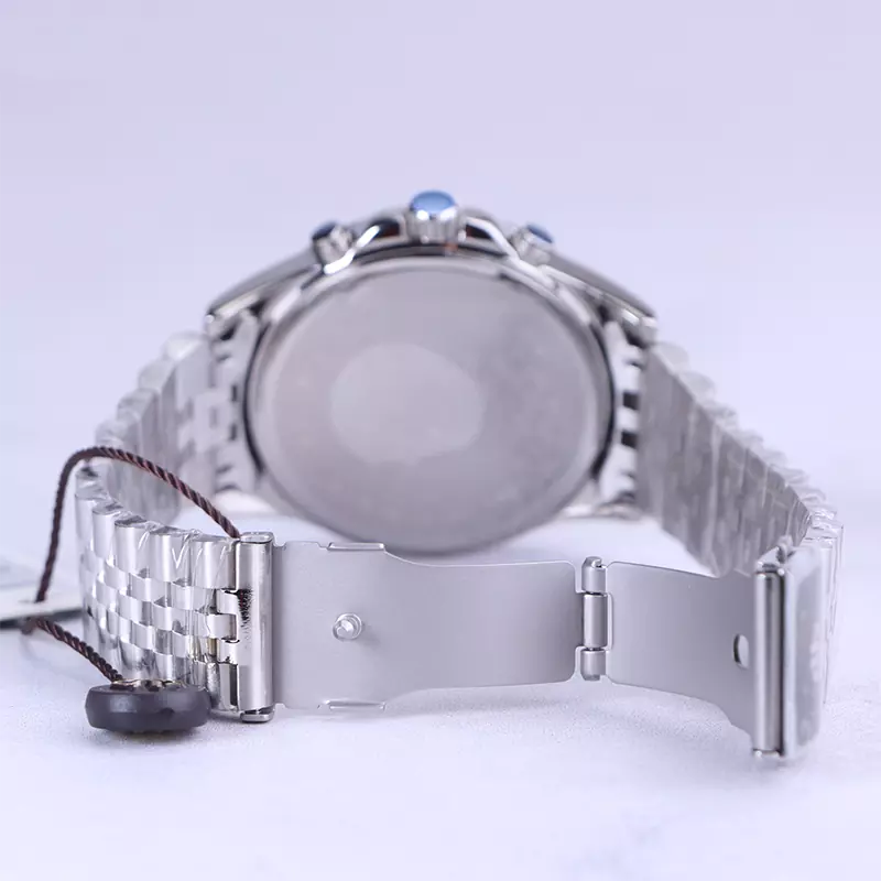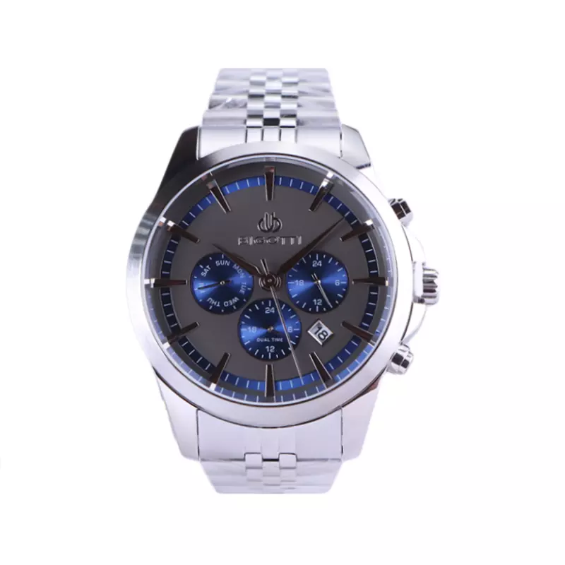 ساعت بیگوتی مردانه فلزی ظاهری مدرن و جذاب دارد. این ساعت استیل نقرهای، رنگ ثابت و ضدحساسیت است. اگر به داخل ساعت نگاه کنید، صفحهی این ساعت به رنگ آبی/دودی است و سه صفحه دایرهای کوچک میبینید که هر کدام از آنها نشان دهندهی پارامتری خاص هستند. یک صفحه که سمت چپ قرار دارد روزهای هفته را نشان میدهد. صفحهی سمت راست ساعت را به صورت 24 ساعته نشان میدهد. اگر از افرادی هستید که امور خود را بر اساس تایم 24 ساعته تنظیم میکنید این صفحه کوچک به کار شما میآید. صفحهی پایینی، dual time یا دو زمانه است. ساعت دو زمانه ساعتی است که به طور هم زمان میتواند دو زمان مختلف مربوط به دو منطقه متفاوت را نمایش دهد. به صورتی که میتوانید با داشتن این ساعت زمان دو کشور متفاوت را در صفحهی این ساعت داشته باشید. یک مربع کوچک بین اعداد 4 و 5 قرار دارد که همان تقویم ساعت است. بند ساعت، از بافت یکدستی تشکیل شده و از نوع فلز مرغوب است که باعث تعرق و خارش نمیشود. اندکسهای این ساعت به صورت خطی نقرهای و عقربههای آن نقرهای طراحی شدهاند. لوگوی برند بیگوتی را زیر عدد 12 میبینید. قفل این ساعت از نوع دوتکه دکمهدار است. در کنار صفحه یک پیچ کوک و دو دکمه برای تنظیم زمان وجود دارد.