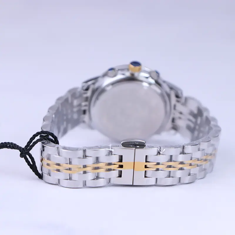 ساعت مچی سیتیزن زنانه فلزی ظاهری مدرن و جذاب دارد. این ساعت استیل نقرهای طلایی، رنگ ثابت و ضدحساسیت است. در واقع این ساعت، طرح سه موتوره است و صفحات کوچکی که میبینید، نمایشی هستند. عقربهها، شبنما و اندکسها خطی و طلایی هستند. اگر به درون صفحه آبی ساعت نگاه کنید، نام برند Citizen زیر ساعت 12 دیده میشود. یک مربع کوچک بین اعداد 4 و 5 قرار دارد که همان تقویم ساعت است. در کنار صفحه یک پیچ کوک برای تنظیم زمان وجود دارد. بند ساعت، فلزی و از نوع استیل مرغوب است که باعث تعرق و خارش نمیشود. این بند از بافت ریز و درشت تشکیل شده که قسمت میانی طلایی و کنارههای آن نقرهای رنگ است. قفل ساعت از مدل پروانهای دکمهدار است که از دسته قفلهای محکم و مطمئن است.