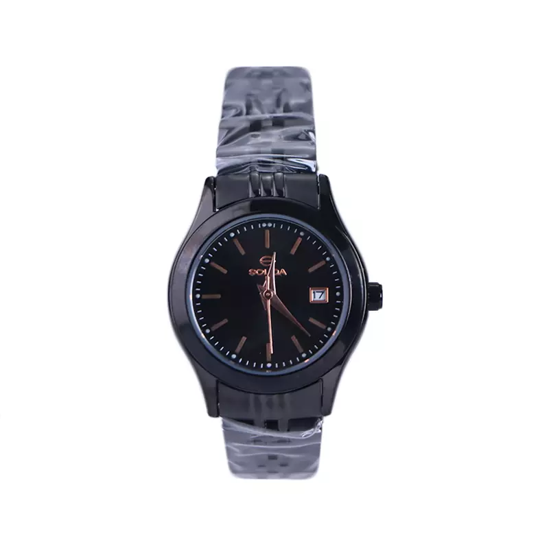 ساعت مچی سولیدا زنانه فلزی مشکی ظاهری کلاسیک و جذاب دارد. اصلی‌ترین چیزی که در ساعت زنانه سولیدا توجه ما را به خود جلب می‌کند، همخوانی رنگ بند با قاب مشکی رنگ ساعت است. اندکس‌های این ساعت به‌صورت خطی و عقربه‌‌های آن رزگلد رنگ طراحی شده‌اند. یک مربع کوچک در موقعیت عدد 3 قرار دارد که تقویم ساعت است. نام برند solida زیر ساعت 12 دیده می‌شود. در کنار صفحه یک پیچ کوک برای تنظیم زمان وجود دارد. این ساعت بند استیل، رنگ ثابت و ضدحساسیت است. بند ساعت از یک بافت ریز و درشت تشکیل شده و مشکی رنگ است. این بند باعث تعرق و خارش نمی‌شود و قفل آن از مدل پروانه‌ای دکمه‌دار است که از دسته قفل‌های محکم و مطمئن است.