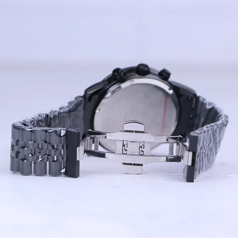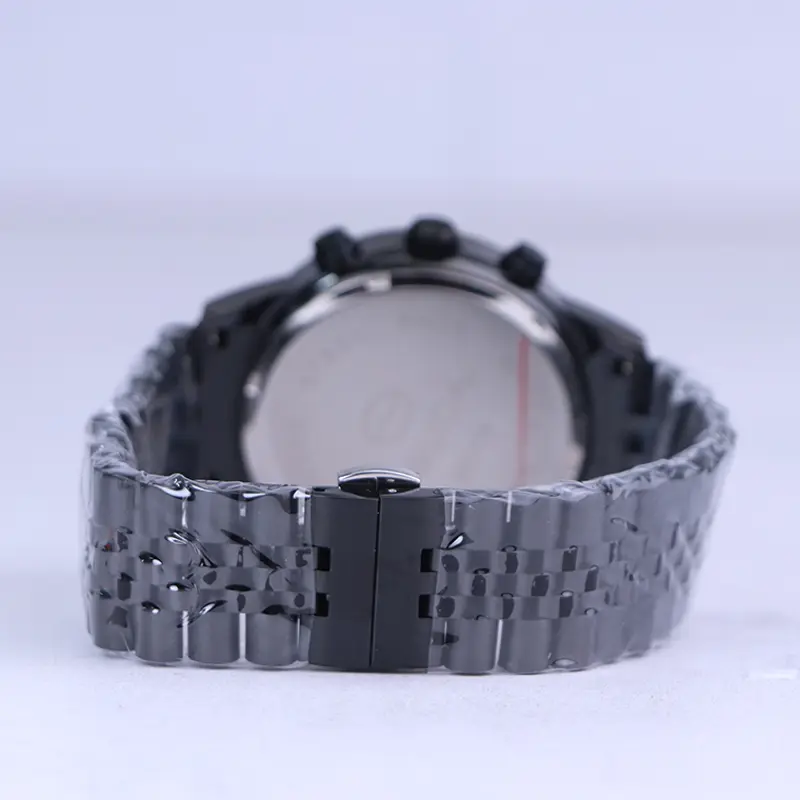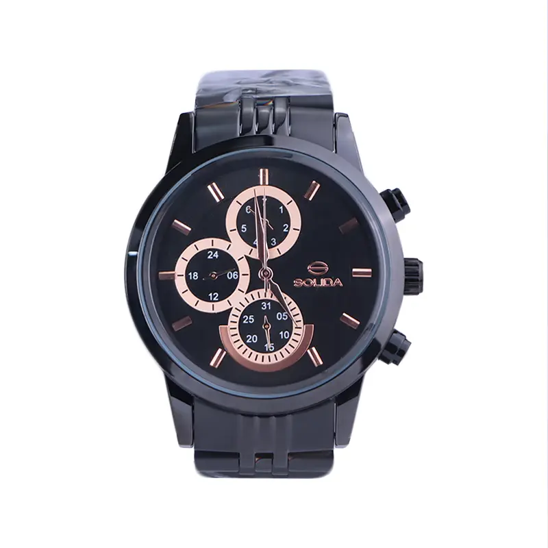 ساعت سولیدا مردانه فلزی ظاهری کلاسیک و جذاب دارد. این ساعت بند استیل مشکی، رنگ ثابت و ضدحساسیت است. اصلیترین چیزی که در ساعت مردانه سولیدا توجه ما را به خود جلب میکند، سه صفحه دایرهای کوچک است، که درون صفحه هستند. دایرههای موجود در صفحهی مشکی ساعت، هر کدام نشان دهندهی پارامتری خاص هستند. صفحهی سمت چپ، ساعت را به صورت ۲۴ ساعت نشان میدهد. صفحهی بالایی روزهای هفته را نشان میدهد. دایرهی پایینی نشان دهندهی روزهای ماه است. اندکسها، خطی رزگلد و عقربهها رزگلد هستند. اگر به درون صفحه نگاه کنید، نام برند solida کنار ساعت 3 دیده میشود. در کنار صفحه سه پیچ کوک برای تنظیم زمان وجود دارد. بند ساعت، فلزی و از نوع استیل مرغوب است که باعث تعرق و خارش نمیشود. طرح این بند از یک بافت ریز و درشت تشکیل شده است و قفل آن از مدل پروانهای دکمهدار است که از دسته قفلهای محکم و مطمئن است.