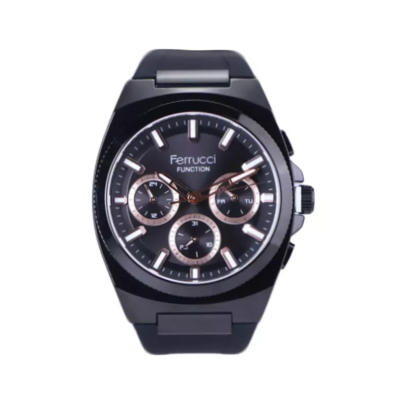 ساعت فروچی مردانه بند رابر مشکی ظاهری مدرن و جذاب دارد. قاب این ساعت استیل مشکی، رنگ ثابت و ضدحساسیت است. اگر به داخل ساعت نگاه کنید، صفحهی این ساعت به رنگ مشکی است و سه صفحه دایرهای کوچک میبینید که هر کدام از آنها نشان دهندهی پارامتری خاص هستند. یک صفحه که در سمت راست قرار دارد روزهای هفته را نشان میدهد. صفحهی سمت چپ ساعت را به صورت 24 ساعته نشان میدهد. اگر از افرادی هستید که امور خود را بر اساس تایم 24 ساعته تنظیم میکنید این صفحه کوچک به کار شما میآید. یک صفحه که وسط قرار دارد همان تقویم ساعت است. بند ساعت رابر مشکی رنگ، مرغوب و ضد حساسیت است. این بند باعث تعرق و خارش نمیشود و قفل آن از مدل کمربندی (سگکی) است که از دسته قفلهای محکم و مطمئن بشمار میرود. اندکسهای این ساعت به صورت خطی شبنما و عقربههای آن رزگلد و شبنما طراحی شدهاند. لوگوی برند فروچی را زیر عدد 12 میبینید. در کنار صفحه یک پیچ کوک و دو دکمه برای تنظیم زمان وجود دارد.