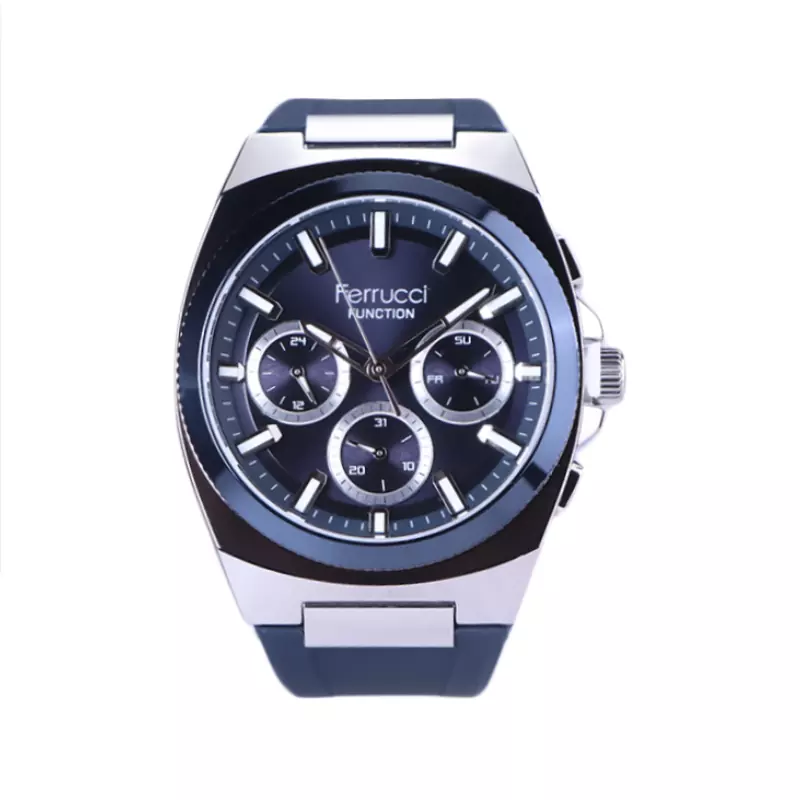 ساعت فروچی مردانه بند رابر سرمهای ظاهری مدرن و جذاب دارد. قاب این ساعت استیل نقرهای، رنگ ثابت و ضدحساسیت است. اگر به داخل ساعت نگاه کنید، صفحهی این ساعت به رنگ سرمهای است و سه صفحه دایرهای کوچک میبینید که هر کدام از آنها نشان دهندهی پارامتری خاص هستند. یک صفحه که در سمت راست قرار دارد روزهای هفته را نشان میدهد. صفحهی سمت چپ ساعت را به صورت 24 ساعته نشان میدهد. اگر از افرادی هستید که امور خود را بر اساس تایم 24 ساعته تنظیم میکنید این صفحه کوچک به کار شما میآید. یک صفحه که وسط قرار دارد همان تقویم ساعت است. بند ساعت رابر سرمهای رنگ، مرغوب و ضد حساسیت است. این بند باعث تعرق و خارش نمیشود و قفل آن از مدل کمربندی (سگکی) است که از دسته قفلهای محکم و مطمئن بشمار میرود. اندکسهای این ساعت به صورت خطی شبنما و عقربههای آن سرمهای و شبنما طراحی شدهاند. لوگوی برند فروچی را زیر عدد 12 میبینید. در کنار صفحه یک پیچ کوک و دو دکمه برای تنظیم زمان وجود دارد.
