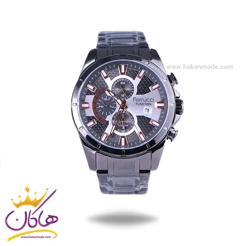 ساعت مچی عقربه ای فروچی مردانه فلزی خاکستری FCF 14336FM/05 ظاهری مدرن و جذاب دارد. این ساعت استیل خاکستری، رنگ ثابت و ضدحساسیت است. اگر به داخل ساعت نگاه کنید، صفحهی این ساعت به رنگ خاکستری/سفید است و سه صفحه دایرهای کوچک میبینید که هر کدام از آنها نشان دهندهی پارامتری خاص هستند. یک صفحه که در سمت چپ قرار دارد روزهای هفته را نشان میدهد. صفحهی بالایی ساعت را به صورت 24 ساعته نشان میدهد. اگر از افرادی هستید که امور خود را بر اساس تایم 24 ساعته تنظیم میکنید این صفحه کوچک به کار شما میآید. یک صفحه که پایین قرار دارد dual time یا دو زمانه است. ساعت دو زمانه ساعتی است که به طور هم زمان میتواند دو زمان مختلف مربوط به دو منطقه متفاوت را نمایش دهد. به صورتی که میتوانید با داشتن این ساعت زمان دو کشور متفاوت را در یک صفحه داشته باشید. یک مربع کوچک بین عدد ۴ و ۳ قرار دارد که همان تقویم ساعت است. بند ساعت فلزی با بافتهای ریز و درشت و از نوع مرغوب است که باعث تعرق و خارش نمیشود. اندکسهای این ساعت به صورت خطی رزگلد و عقربههای آن شبنما طراحی شدهاند. لوگوی برند فروچی را کنار عدد ۳ میبینید. قفل این ساعت از نوع دوتکه دکمهدار است و ساعت به راحتی از دست نمیافتد. در کنار صفحه یک پیچ کوک و دو دکمه برای تنظیم زمان وجود دارد.