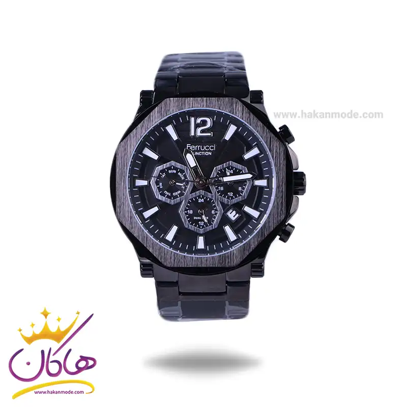 ساعت مچی عقربه ای فروچی مردانه فلزی مشکی FC03255/04 ظاهری مدرن و جذاب دارد. این ساعت استیل مشکی، رنگ ثابت و ضدحساسیت است. اگر به داخل ساعت نگاه کنید، صفحهی این ساعت به رنگ مشکی است و سه صفحه چندضلعی کوچک میبینید که هر کدام از آنها نشان دهندهی پارامتری خاص هستند. یک صفحه که در سمت چپ قرار دارد روزهای هفته را نشان میدهد. صفحهی سمت راست ساعت را به صورت 24 ساعته نشان میدهد. اگر از افرادی هستید که امور خود را بر اساس تایم 24 ساعته تنظیم میکنید این صفحه کوچک به کار شما میآید. یک صفحه که پایین قرار دارد برای نشان دادن زمان دوم است. یعنی این ساعت به طور هم زمان میتواند دو زمان مختلف مربوط به دو منطقه متفاوت را نمایش دهد. به صورتی که میتوانید با داشتن این ساعت زمان دو کشور متفاوت را در یک صفحه داشته باشید. یک مربع کوچک بین عدد ۴ و 5 قرار دارد که همان تقویم ساعت است. بند ساعت فلزی با بافتهای ریز و درشت و از نوع مرغوب است که باعث تعرق و خارش نمیشود. اندکسهای این ساعت به صورت خطی نقره ای و عقربههای آن شبنما طراحی شدهاند. لوگوی برند فروچی را زیر عدد 12 میبینید. قفل این ساعت از نوع دوتکه دکمهدار است و ساعت به راحتی از دست نمیافتد. در کنار صفحه یک پیچ کوک و دو دکمه برای تنظیم زمان وجود دارد.