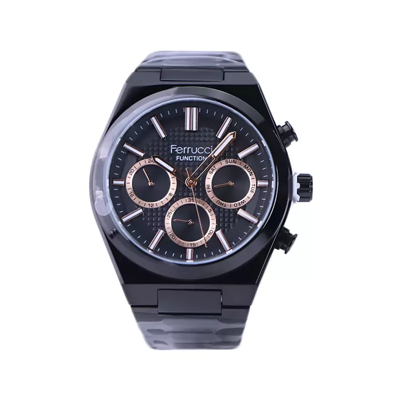 ساعت فروچی مردانه فلزی ظاهری مدرن و جذاب دارد. این ساعت استیل مشکی، رنگ ثابت و ضدحساسیت است. اگر به داخل ساعت نگاه کنید، صفحه‌ی این ساعت به رنگ مشکی و طرحدار است و سه صفحه دایره‌ای کوچک و  قاب رزگلد می‌بینید که هر کدام از آنها نشان دهنده‌ی پارامتری خاص هستند. یک صفحه که در سمت راست قرار دارد روز‌های هفته را نشان می‌دهد. صفحه‌ی سمت چپ ساعت را به صورت 24 ساعته نشان می‌دهد. اگر از افرادی هستید که امور خود را بر اساس تایم 24 ساعته تنظیم می‌کنید این صفحه کوچک به کار شما می‌آید. یک صفحه که پایین قرار دارد همان تقویم ساعت است. بند ساعت فلزی با بافت‌های ریز و درشت و از نوع مرغوب است که باعث تعرق و خارش نمی‌شود. اندکس‌های این ساعت به صورت خطی شبنما و عقربه‌های آن رزگلد و شبنما طراحی شده‌اند. لوگوی برند فروچی را زیر عدد 12 می‌بینید. قفل این ساعت از نوع پروانه‌ای دکمه‌دار است و ساعت به راحتی از دست نمی‌افتد. در کنار صفحه یک پیچ کوک و دو دکمه برای تنظیم زمان وجود دارد.