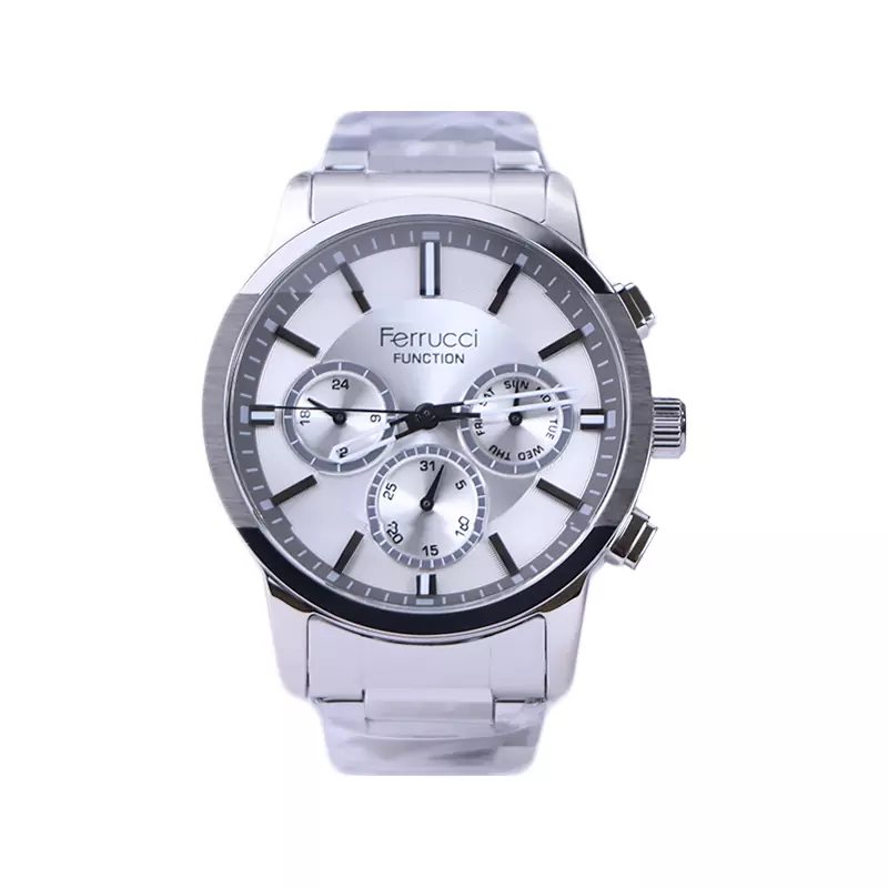 ساعت فروچی مردانه فلزی ظاهری مدرن و جذاب دارد. این ساعت استیل نقرهای، رنگ ثابت و ضدحساسیت است. اگر به داخل ساعت نگاه کنید، صفحهی این ساعت به رنگ سفید است و سه صفحه دایرهای کوچک میبینید که هر کدام از آنها نشان دهندهی پارامتری خاص هستند. یک صفحه که در سمت راست قرار دارد روزهای هفته را نشان میدهد. صفحهی سمت چپ ساعت را به صورت 24 ساعته نشان میدهد. اگر از افرادی هستید که امور خود را بر اساس تایم 24 ساعته تنظیم میکنید این صفحه کوچک به کار شما میآید. یک صفحه که پایین قرار دارد همان تقویم ساعت است. بند ساعت فلزی با بافتهای ریز و درشت و از نوع مرغوب است که باعث تعرق و خارش نمیشود. اندکسهای این ساعت به صورت خطی شبنما و عقربههای آن شبنما طراحی شدهاند. لوگوی برند فروچی را زیر عدد 12 میبینید. قفل این ساعت از نوع دوتکه دکمهدار است و ساعت به راحتی از دست نمیافتد. در کنار صفحه یک پیچ کوک و دو دکمه برای تنظیم زمان وجود دارد.
