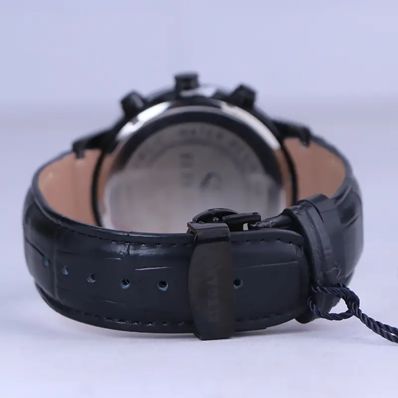 ساعت الگانس مردانه بند چرم مشکی ظاهری مدرن و جذاب دارد. قاب این ساعت به رنگ استیل مشکی، رنگ ثابت و ضدحساسیت است. در واقع این ساعت، طرح سه موتوره است و صفحات کوچکی که میبینید، نمایشی هستند. داشتن اندکسهای خطی نقرهای و عقربههای شب رنگ به شما این امکان را میدهد که در شب و محیطهای کم نور هم گذر زمان را ببینید. اگر به درون صفحه مشکی ساعت نگاه کنید، نام برند ELEGANCE کنار ساعت 3 قرار دارد. یک دایره کوچک بین اعداد 4 و 5 قرار دارد که تقویم ساعت است. بند ساعت از نوع چرم مرغوب است که پوسته پوسته و بریده نمیشود، همچنین باعث تعرق و خارش نمیشود. قفل این ساعت از مدل پروانهای دکمهدار است و ساعت به راحتی از دست نمیافتد. این مدل قفل، مثل قفل کمربندی روی بند ترک یا بریدگی ایجاد نمیکند و از محبوبترین قفلها است.