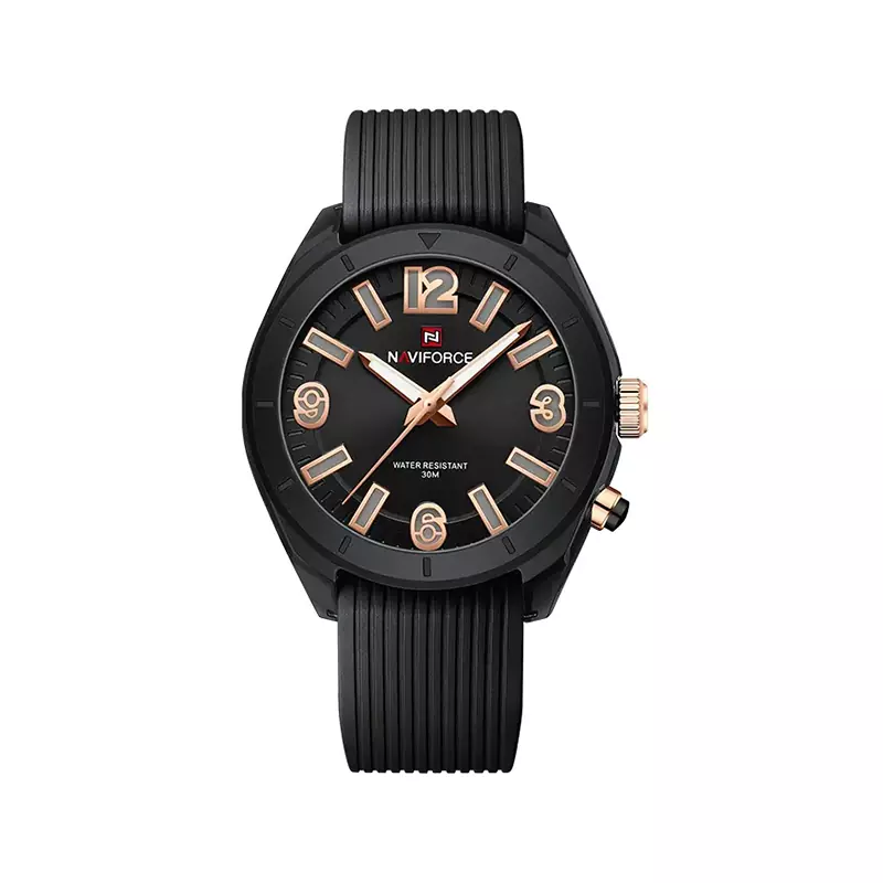 ساعت مچی نیوی فروس زنانه بند رابر مشکی ظاهری شیک و جذاب دارد. قاب این ساعت از رزین و پلاستیک فشرده طراحی شده که رنگ ثابت و ضدحساسیت است. اصلیترین چیزی که در ساعت زنانه نیوی فروس توجه ما را به خود جلب میکند، صفحهی مشکی رنگ ساعت است. اگر به داخل ساعت نگاه کنید میبینید که اندکسهای آن به صورت ترکیبی خطی و عددی هستند. این ساعت Naviforce دارای یک ویژگی خاص است؛ در کنار صفحه یک دکمه طراحی شده که با فشردن آن، چراغ داخلی فعال میشود و اندکسها (اعداد و نشانگرهای ساعت) روشن میگردند. این قابلیت باعث میشود بتوانید حتی در تاریکی به راحتی زمان را مشاهده کنید و جلوهای مدرن و جذاب به ساعت میبخشد. عقربه های آن نیز رزگلد و شبنما هستند. نام برند نیوی فروس زیر ساعت 12 دیده میشود. در کنار صفحه یک پیچ کوک برای تنظیم زمان وجود دارد. بند ساعت رابر مشکی، مرغوب و ضد حساسیت است. این بند باعث تعرق و خارش نمیشود و قفل آن از مدل کمربندی (سگکی) است که از دسته قفلهای محکم و مطمئن بشمار میرود.