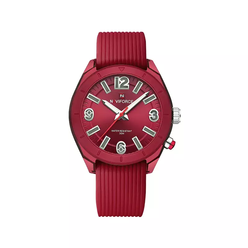 ساعت مچی نیوی فروس زنانه بند رابر قرمز ظاهری شیک و جذاب دارد. قاب این ساعت از رزین و پلاستیک فشرده طراحی شده که رنگ ثابت و ضدحساسیت است. اصلی‌ترین چیزی که در ساعت زنانه نیوی فروس توجه ما را به خود جلب می‌کند، صفحه‌ی قرمز رنگ ساعت است. اگر به داخل ساعت نگاه کنید میبینید که اندکس‌های آن به صورت ترکیبی خطی و عددی هستند. این ساعت Naviforce دارای یک ویژگی خاص است؛ در کنار صفحه یک دکمه طراحی شده که با فشردن آن، چراغ داخلی فعال می‌شود و اندکس‌ها (اعداد و نشانگرهای ساعت) روشن می‌گردند. این قابلیت باعث می‌شود بتوانید حتی در تاریکی به راحتی زمان را مشاهده کنید و جلوه‌ای مدرن و جذاب به ساعت می‌بخشد. عقربه‌ های آن نیز رزگلد و شبنما هستند. نام برند نیوی فروس زیر ساعت 12 دیده می‌شود. در کنار صفحه یک پیچ کوک برای تنظیم زمان وجود دارد. بند ساعت رابر قرمز، مرغوب و ضد حساسیت است. این بند باعث تعرق و خارش نمی‌شود و قفل آن از مدل کمربندی (سگکی) است که از دسته قفل‌های محکم و مطمئن بشمار می‌رود.