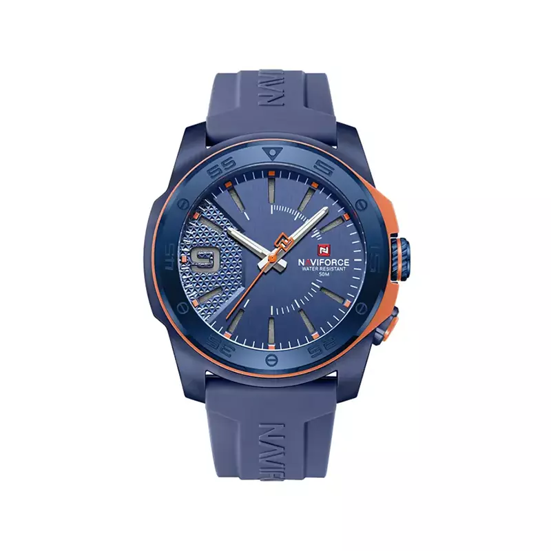 ساعت مچی نیوی فروس مردانه بند رابر ظاهری شیک و جذاب دارد. قاب این ساعت از استیل آبی/نارنجی، رنگ ثابت و ضدحساسیت است. اصلیترین چیزی که در ساعت مردانه نیوی فروس توجه ما را به خود جلب میکند، صفحهی آبی رنگ ساعت است. اگر به داخل ساعت نگاه کنید میبینید که اندکسهای آن به صورت خطی و فرورفته هستند فقط اندکس موقعیت ساعت 9 به صورت عدد طراحی شده است. این ساعت Naviforce دارای یک ویژگی خاص است؛ در کنار صفحه یک دکمه طراحی شده که با فشردن آن، چراغ داخلی فعال میشود و اندکسها (اعداد و نشانگرهای ساعت) روشن میگردند. این قابلیت باعث میشود بتوانید حتی در تاریکی به راحتی زمان را مشاهده کنید و جلوهای مدرن و جذاب به ساعت میبخشد. عقربه های آن نیز نقرهای و شبنما هستند. نام برند نیوی فروس کنار ساعت 3 دیده میشود. در کنار صفحه یک پیچ کوک برای تنظیم زمان وجود دارد. بند ساعت رابر آبی، مرغوب و ضد حساسیت است. این بند باعث تعرق و خارش نمیشود و قفل آن از مدل کمربندی (سگکی) است که از دسته قفلهای محکم و مطمئن بشمار میرود.