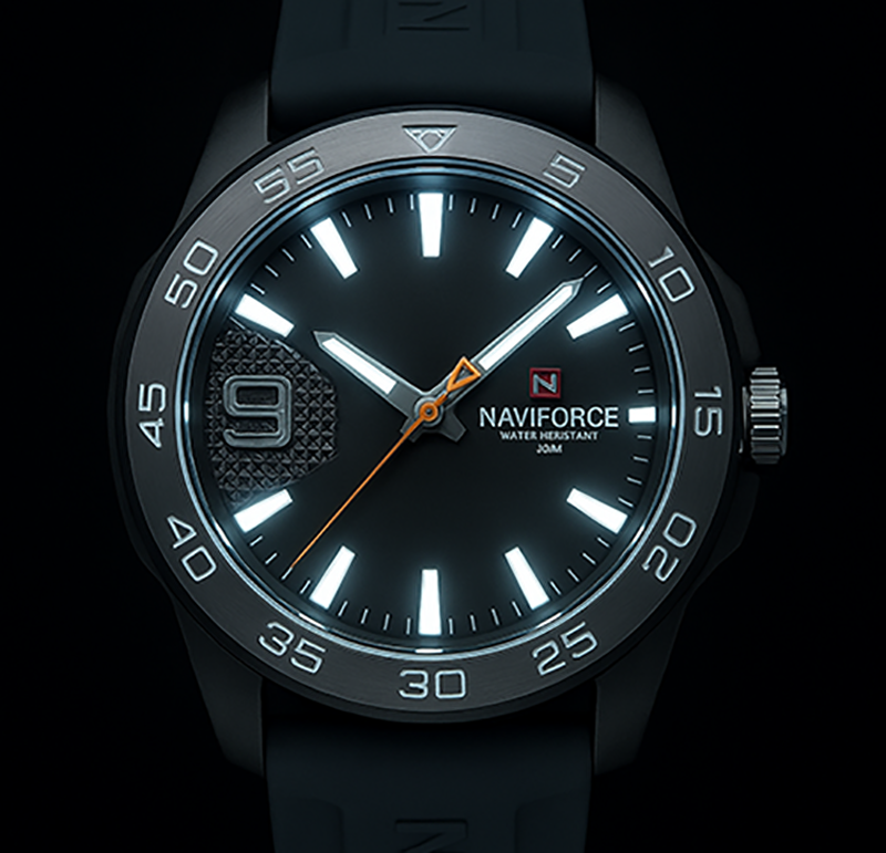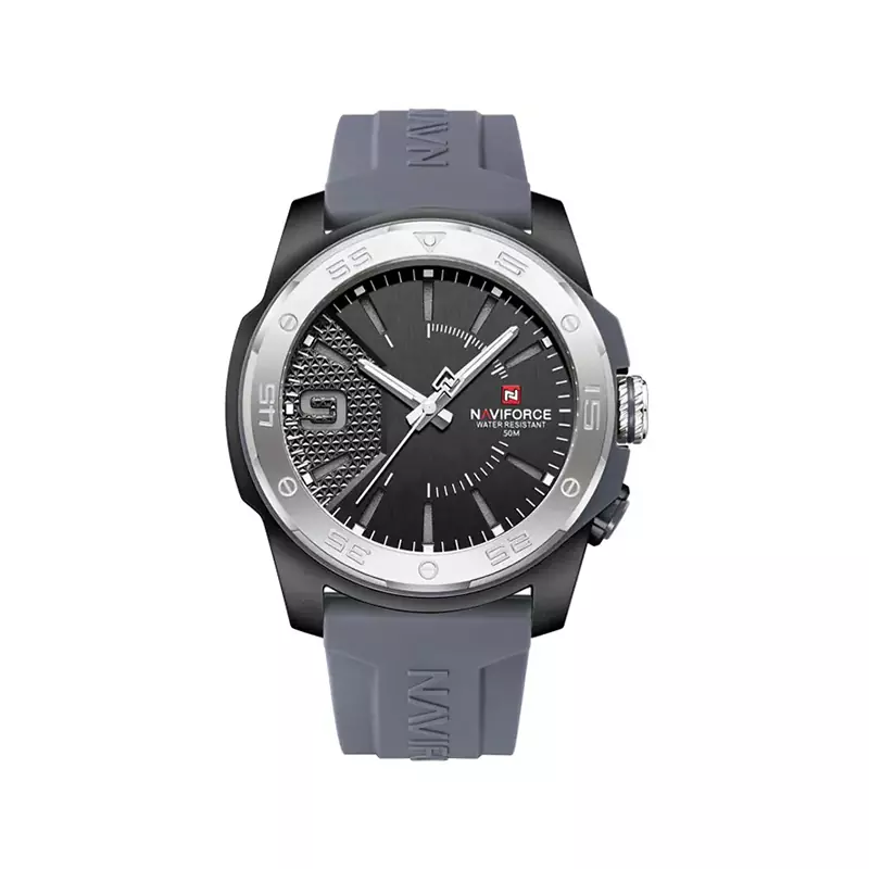 ساعت مچی نیوی فروس مردانه بند رابر ظاهری شیک و جذاب دارد. قاب این ساعت از استیل نقرهای، رنگ ثابت و ضدحساسیت است. اصلیترین چیزی که در ساعت مردانه نیوی فروس توجه ما را به خود جلب میکند، صفحهی مشکی رنگ ساعت است. اگر به داخل ساعت نگاه کنید میبینید که اندکسهای آن به صورت خطی و فرورفته هستند فقط اندکس موقعیت ساعت 9 به صورت عدد طراحی شده است. این ساعت Naviforce دارای یک ویژگی خاص است؛ در کنار صفحه یک دکمه طراحی شده که با فشردن آن، چراغ داخلی فعال میشود و اندکسها (اعداد و نشانگرهای ساعت) روشن میگردند. این قابلیت باعث میشود بتوانید حتی در تاریکی به راحتی زمان را مشاهده کنید و جلوهای مدرن و جذاب به ساعت میبخشد. عقربه های آن نیز نقرهای و شبنما هستند. نام برند نیوی فروس کنار ساعت 3 دیده میشود. در کنار صفحه یک پیچ کوک برای تنظیم زمان وجود دارد. بند ساعت رابر طوسی، مرغوب و ضد حساسیت است. این بند باعث تعرق و خارش نمیشود و قفل آن از مدل کمربندی (سگکی) است که از دسته قفلهای محکم و مطمئن بشمار میرود.
