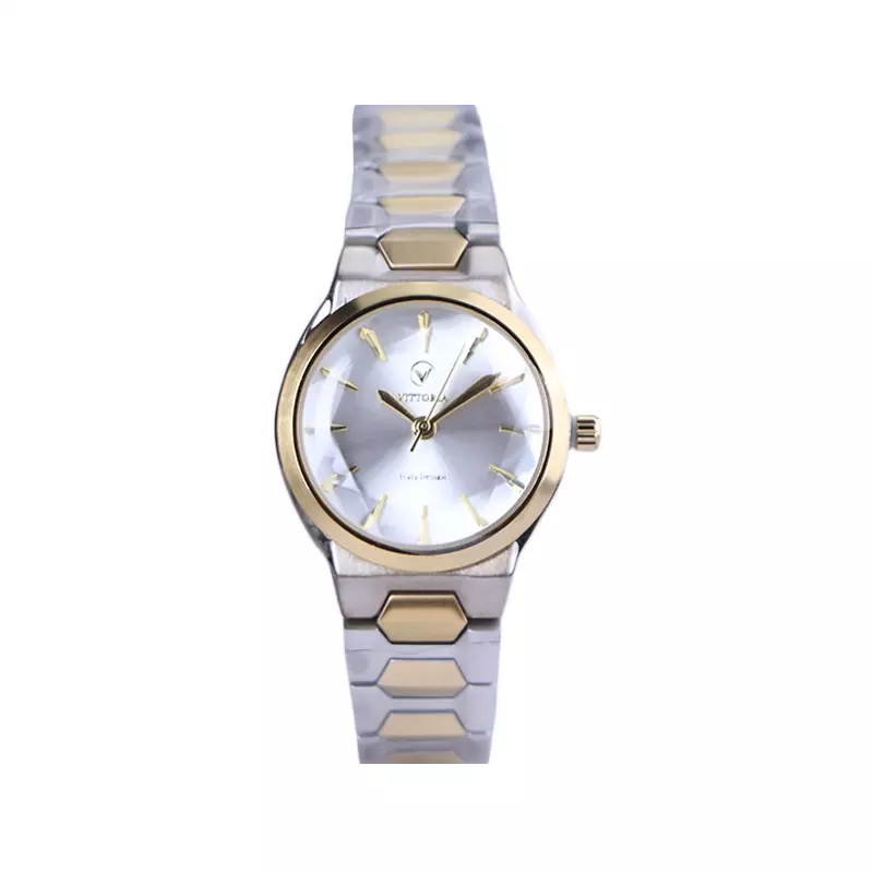ساعت ویتوریا زنانه فلزی نقره‌ای طلایی ظاهری کلاسیک و جذاب دارد. این ساعت عقربه‌ای زنانه شیک استیل، رنگ ثابت و ضدحساسیت است. اصلی‌ترین چیزی که در ساعت زنانه ویتوریا توجه ما را به خود جلب می‌کند، صفحه‌‌ی سفید رنگ و شیشه‌‍‌ی تراش کاری شده ساعت است. اگر به داخل ساعت نگاه کنید اندکس‌های این ساعت خطی و طلایی و عقربه‌های آن طلایی هستند. نام برند ویتوریا زیر ساعت 12 دیده می‌شود. در کنار صفحه یک پیچ کوک برای تنظیم زمان وجود دارد. بند ساعت، از بافت یکدست تشکیل شده که قسمت میانی طلایی و کناره‌های آن نقره‌ای رنگ است. همچنین جنس بند فلزی و از نوع استیل مرغوب است که باعث تعرق و خارش نمی‌شود. قفل آن از مدل دو‌تکه دکمه‌دار است که از دسته قفل‌های محکم و مطمئن است.