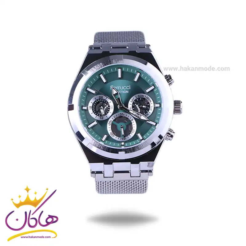 ساعت مچی فروچی مردانه فلزی بند حصیری نقره ای صفحه سبز FC03290/02 ظاهری مدرن و جذاب دارد. این ساعت استیل نقره ای، رنگ ثابت و ضدحساسیت است. اگر به داخل ساعت نگاه کنید، صفحهی این ساعت به رنگ سبز است و سه صفحه دایرهای کوچک قاب نقره ای میبینید که هر کدام از آنها نشان دهندهی پارامتری خاص هستند. یک صفحه که در سمت راست قرار دارد روزهای هفته را نشان میدهد. صفحهی سمت چپ ساعت را به صورت 24 ساعته نشان میدهد. اگر از افرادی هستید که امور خود را بر اساس تایم 24 ساعته تنظیم میکنید این صفحه کوچک به کار شما میآید. یک صفحه که پایین قرار دارد روزهای ماه را نشان میدهد. بند ساعت، از نوع حصیری و به رنگ نقره ای است. همچنین جنس بند فلزی و از نوع استیل مرغوب است که باعث تعرق و خارش نمیشود. قفل آن از مدل کلیپسی است که به صورت ریلی میتوانید آن را تنظیم کنید و از دسته قفلهای محکم و مطمئن است. اندکسهای این ساعت به صورت خطی نقره ای و عقربههای آن شبنما طراحی شدهاند. لوگوی برند فروچی را زیر عدد 12 میبینید. در کنار صفحه یک پیچ کوک و دو دکمه برای تنظیم زمان وجود دارد.