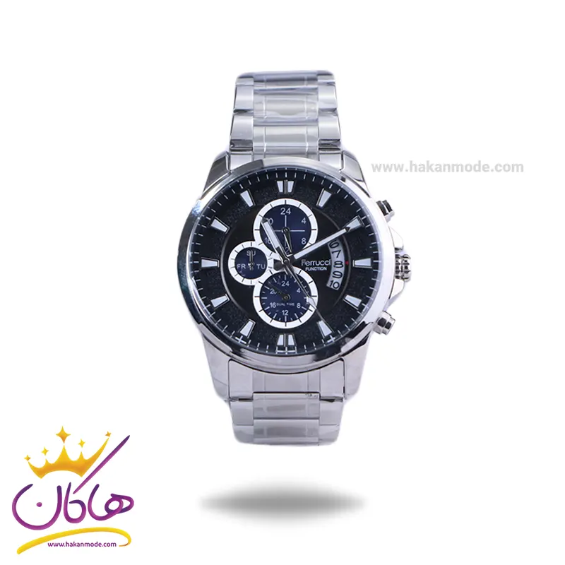 ساعت فروچی مردانه فلزی ظاهری مدرن و جذاب دارد. این ساعت استیل نقرهای، رنگ ثابت و ضدحساسیت است. اگر به داخل ساعت نگاه کنید، صفحهی این ساعت به رنگ مشکی است و سه صفحه دایرهای کوچک سرمهای رنگ میبینید که هر کدام از آنها نشان دهندهی پارامتری خاص هستند. یک صفحه که در سمت چپ قرار دارد روزهای هفته را نشان میدهد. صفحهی بالا ساعت را به صورت 24 ساعته نشان میدهد. اگر از افرادی هستید که امور خود را بر اساس تایم 24 ساعته تنظیم میکنید این صفحه کوچک به کار شما میآید. یک صفحه که پایین قرار دارد برای نشان دادن زمان دوم است. یعنی این ساعت به طور هم زمان میتواند دو زمان مختلف مربوط به دو منطقه متفاوت را نمایش دهد. به صورتی که میتوانید با داشتن این ساعت زمان دو کشور متفاوت را در یک صفحه داشته باشید. تقویم این ساعت مقابل عدد 3 قرار دارد. بند ساعت فلزی با بافتهای ریز و درشت و از نوع مرغوب است که باعث تعرق و خارش نمیشود. اندکسهای این ساعت به صورت خطی شبنما و عقربههای آن شبنما طراحی شدهاند. لوگوی برند فروچی را کنار عدد 3 میبینید. قفل این ساعت از نوع دوتکه دکمهدار است و ساعت به راحتی از دست نمیافتد. در کنار صفحه یک پیچ کوک و دو دکمه برای تنظیم زمان وجود دارد.