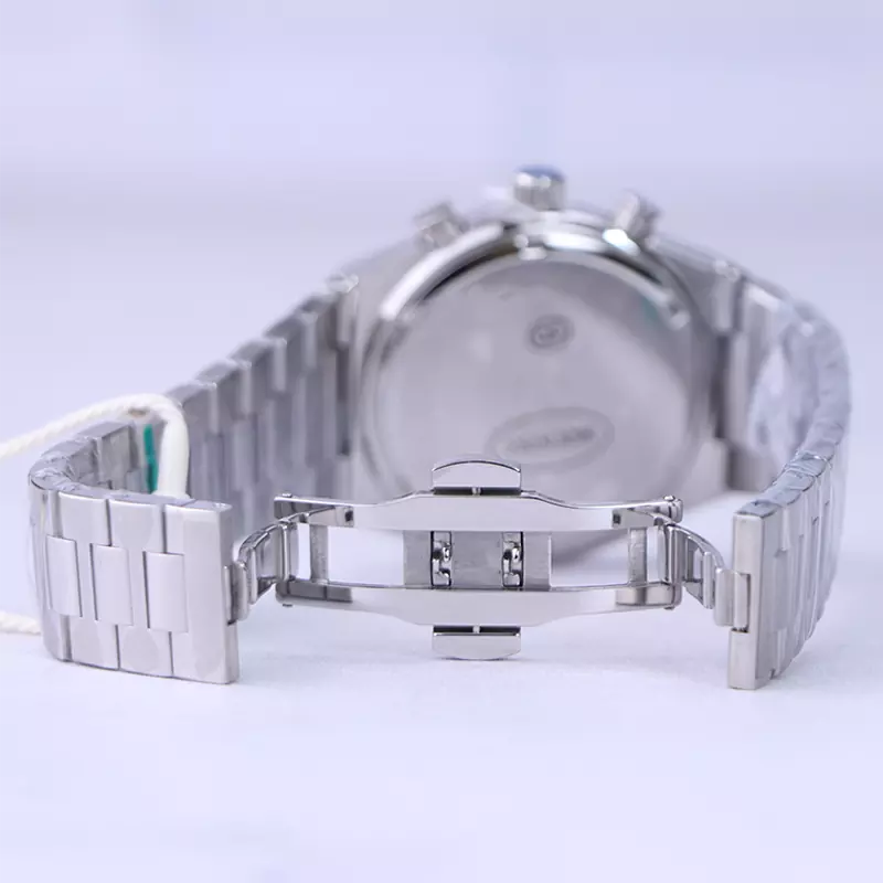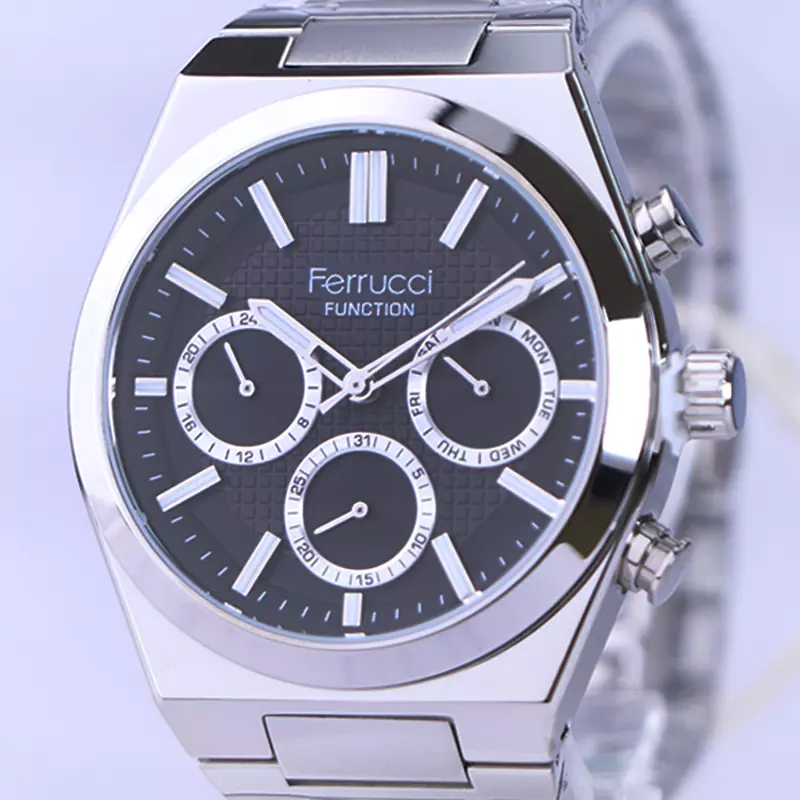 ساعت فروچی مردانه فلزی ظاهری مدرن و جذاب دارد. این ساعت استیل نقرهای، رنگ ثابت و ضدحساسیت است. اگر به داخل ساعت نگاه کنید، صفحهی این ساعت به رنگ مشکی و طرحدار است و سه صفحه دایرهای کوچک و قاب نقرهای میبینید که هر کدام از آنها نشان دهندهی پارامتری خاص هستند. یک صفحه که در سمت راست قرار دارد روزهای هفته را نشان میدهد. صفحهی سمت چپ ساعت را به صورت 24 ساعته نشان میدهد. اگر از افرادی هستید که امور خود را بر اساس تایم 24 ساعته تنظیم میکنید این صفحه کوچک به کار شما میآید. یک صفحه که پایین قرار دارد همان تقویم ساعت است. بند ساعت فلزی با بافتهای ریز و درشت و از نوع مرغوب است که باعث تعرق و خارش نمیشود. اندکسهای این ساعت به صورت خطی شبنما و عقربههای آن نقرهای و شبنما طراحی شدهاند. لوگوی برند فروچی را زیر عدد 12 میبینید. قفل این ساعت از نوع پروانهای دکمهدار است و ساعت به راحتی از دست نمیافتد. در کنار صفحه یک پیچ کوک و دو دکمه برای تنظیم زمان وجود دارد.