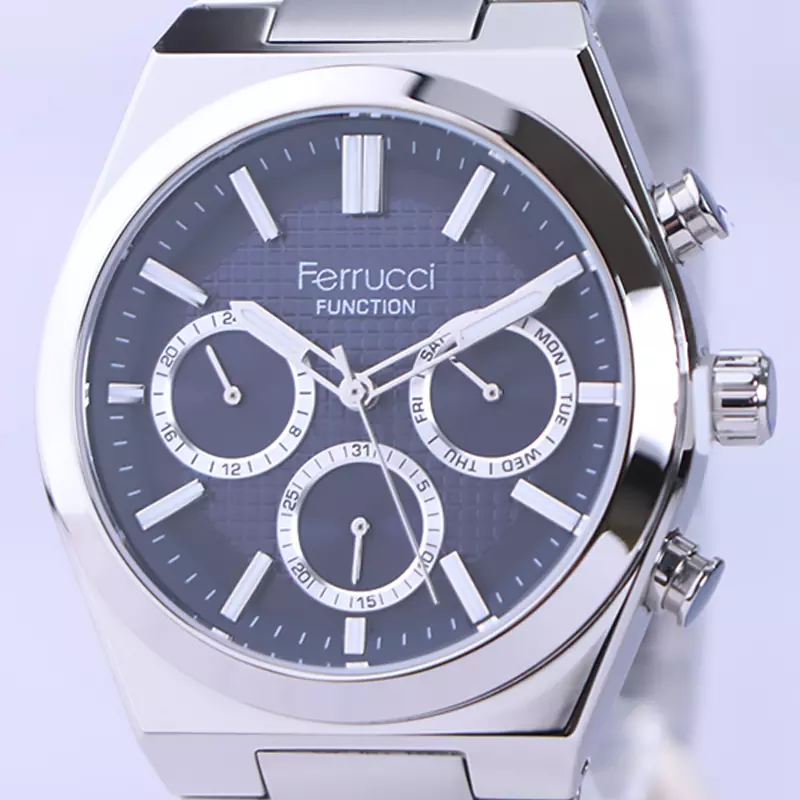 ساعت فروچی مردانه فلزی ظاهری مدرن و جذاب دارد. این ساعت استیل نقره‌ای، رنگ ثابت و ضدحساسیت است. اگر به داخل ساعت نگاه کنید، صفحه‌ی این ساعت به رنگ سرمه‌ای و طرحدار است و سه صفحه دایره‌ای کوچک و قاب نقره‌ای می‌بینید که هر کدام از آنها نشان دهنده‌ی پارامتری خاص هستند. یک صفحه که در سمت راست قرار دارد روز‌های هفته را نشان می‌دهد. صفحه‌ی سمت چپ ساعت را به صورت 24 ساعته نشان می‌دهد. اگر از افرادی هستید که امور خود را بر اساس تایم 24 ساعته تنظیم می‌کنید این صفحه کوچک به کار شما می‌آید. یک صفحه که پایین قرار دارد همان تقویم ساعت است. بند ساعت فلزی با بافت‌های ریز و درشت و از نوع مرغوب است که باعث تعرق و خارش نمی‌شود. اندکس‌های این ساعت به صورت خطی شبنما و عقربه‌های آن نقره‌ای و شبنما طراحی شده‌اند. لوگوی برند فروچی را زیر عدد 12 می‌بینید. قفل این ساعت از نوع پروانه‌ای دکمه‌دار است و ساعت به راحتی از دست نمی‌افتد. در کنار صفحه یک پیچ کوک و دو دکمه برای تنظیم زمان وجود دارد.