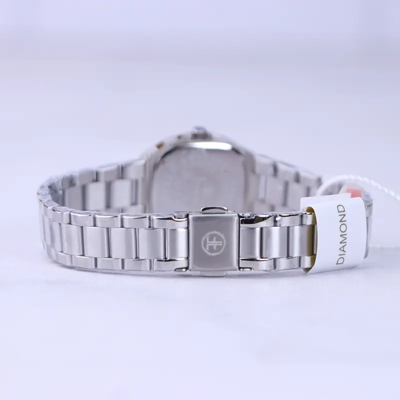 ساعت مچی فری لوک زنانه استیل نقره ای ظاهری کلاسیک و جذاب دارد. این ساعت استیل، رنگ ثابت و ضدحساسیت است. اصلیترین چیزی که در ساعت زنانه فری لوک توجه ما را به خود جلب میکند، قاب مربع شکل ساعت است که دور تا دور آن نگین کاری شده است. عقربهها، نقرهای و اندکسها خطی و نقره ای هستند. صفحهی ساعت سفید رنگ است که نام برند فری لوک زیر ساعت 12 دیده میشود. در کنار صفحه یک پیچ کوک برای تنظیم زمان وجود دارد. بند ساعت، فلزی و از نوع استیل مرغوب است که باعث تعرق و خارش نمیشود. بند ساعت از بافت یکدست تشکیل شده که نقره ای رنگ است. قفل آن از مدل دوتکه دکمه دار است که از دسته قفلهای محکم و مطمئن است.