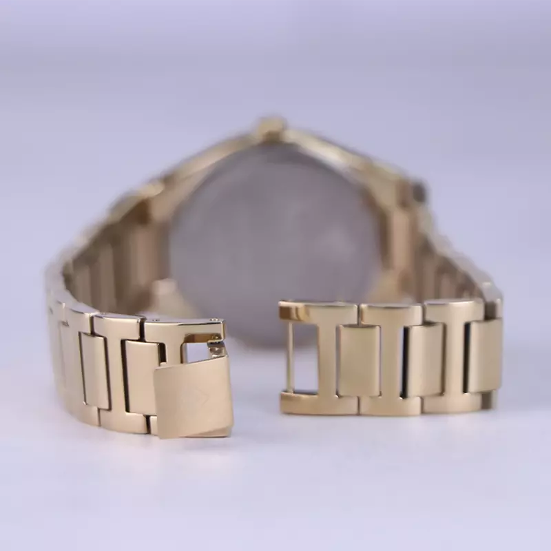 ساعت لاکسمی زنانه فلزی ظاهری کلاسیک و جذاب دارد. این ساعت استیل طلایی، رنگ ثابت و ضدحساسیت است. اصلیترین چیزی که در ساعت زنانه لاکسمی توجه ما را به خود جلب میکند، قاب طلایی و نگیندار ساعت است که بر شیکی آن افزوده است. اگر به درون صفحه دقت کنید، صفحهی این ساعت سفید صدفی است. عقربهها، طلایی و اندکسها خطی و طلایی هستند. نام برند Laxmi زیر ساعت 12 دیده میشود. در سمت راست مربع کوچکی وجود دارد که نشانگر روزهای ماه بوده و همان تقویم ساعت است. در کنار صفحه یک پیچ کوک برای تنظیم زمان وجود دارد. بند ساعت، فلزی و از نوع استیل مرغوب است که باعث تعرق و خارش نمیشود. طرح این بند از یک بافت ریز و درشت تشکیل شده که طلایی رنگ است. قفل این ساعت عقربهای زنانه از مدل جواهری ر است که از دسته قفلهای محکم و مطمئن است.