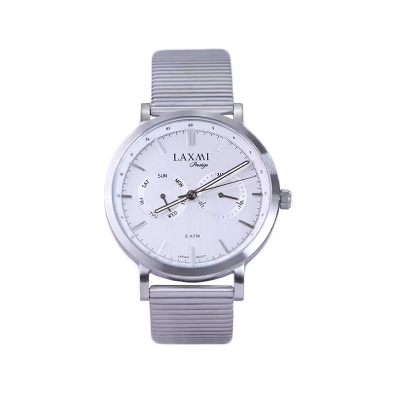 ساعت لاکسمی مردانه فلزی ظاهری مدرن و جذاب دارد. این ساعت استیل نقره‌ای، رنگ ثابت و ضدحساسیت است. اگر به داخل ساعت نگاه کنید، صفحه‌ی این ساعت به رنگ سفید است و دو صفحه دایره‌ای کوچک می‌بینید که هر کدام از آنها نشان دهنده‌ی پارامتری خاص هستند. یک صفحه که سمت چپ قرار دارد روزهای هفته را نشان می‌دهد. دایره‌ی سمت راست نشانگر روزهای ماه است. طرح این بند از یک بافت یکدست و شیاردار تشکیل شده و نقره‌ای رنگ است. این بند از نوع فلز مرغوب است که باعث تعرق و خارش نمی‌شود. اندکس‌های این ساعت خطی و عقربه‌های آن نقره‌ای و شبنما طراحی شده‌اند. لوگوی برند لاکسمی را زیر عدد 12 می‌بینید. قفل این ساعت از نوع کلیپسی است به صورت ریلی می‌توانید آن را تنظیم کنید و ساعت به راحتی از دست نمی‌افتد. در کنار صفحه یک پیچ کوک برای تنظیم زمان وجود دارد.
