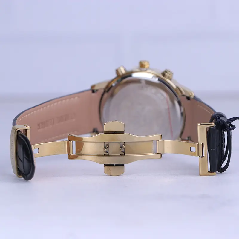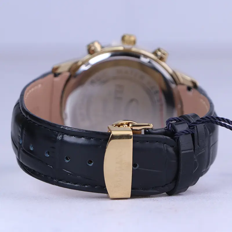 نمای باز ساعت مچی مردانه الگانس قاب طلایی بند چرم مشکی G 1236/3