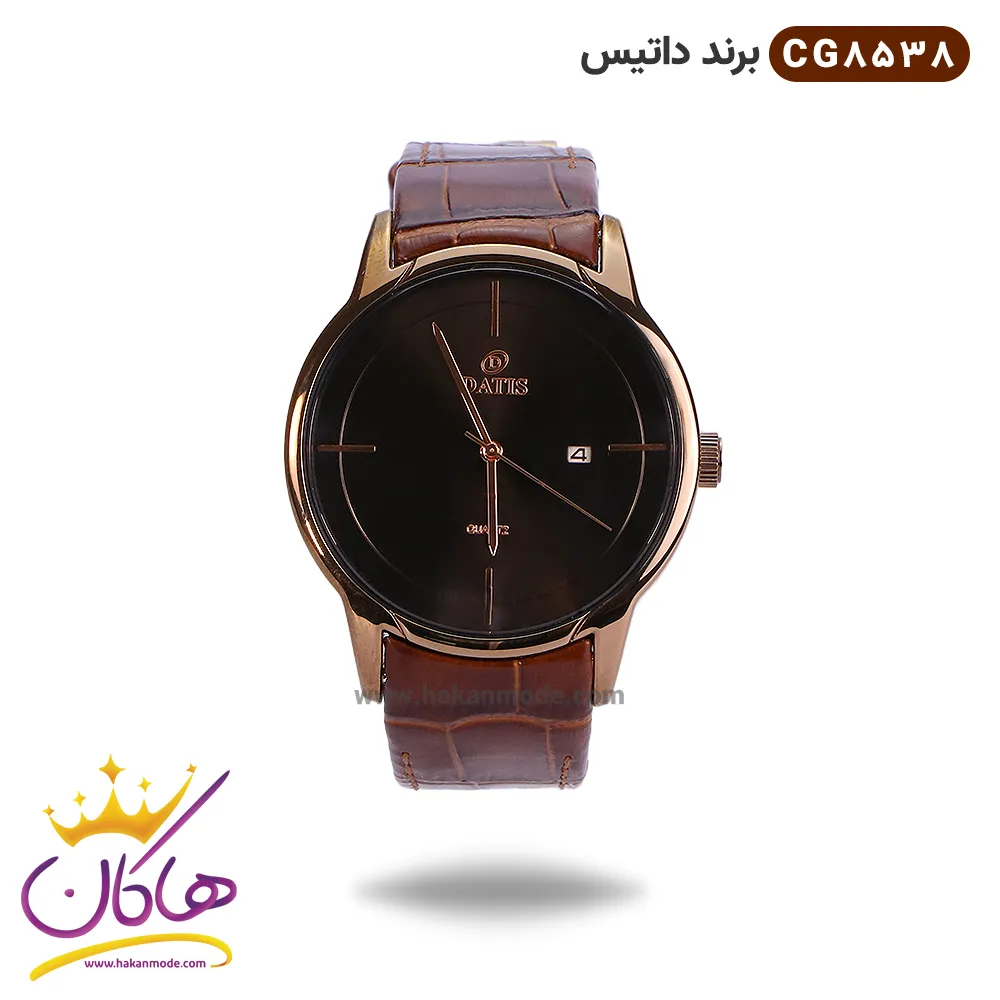 ساعت مچی مردانه داتیس بند چرمی صفحه مشکی مدل Datis CG 8538 ظاهری کلاسیک و جذاب دارد. قاب استیل قهوه ای آن، رنگ ثابت و ضدحساسیت است. موتور این ساعت ساخت ژاپن و از نوع کوارتز است. ساعت داتیس بند چرمی قهوه ای اورجینال یکسال گارانتی موتور و تا پنج سال گارانتی تعویض باتری دارد. ضد آب بودن در حد 3 ATM یکی دیگر از ویژگی های این ساعت است. ساعت داتیس از نظر قیمت در حد متوسط و از نظر کیفیت مطلوب و مورد تایید است.