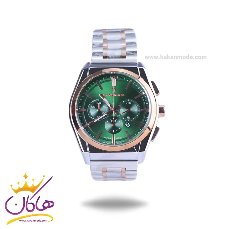 ساعت مچی رومانسون مردانه فلزی ظاهری مدرن و جذاب دارد. این ساعت استیل نقرهای رزگلد، رنگ ثابت و ضدحساسیت است. در واقع این ساعت، طرح سه موتوره است و صفحات کوچکی که میبینید، نمایشی هستند. عقربهها، شبنما و اندکسها خطی و رزگلد هستند. اگر به درون صفحه سبز رنگ ساعت نگاه کنید، نام برند رومانسون زیر ساعت 12 دیده میشود. یک مربع کوچک بین اعداد 4 و 5 قرار دارد که همان تقویم ساعت است. در کنار صفحه یک پیچ کوک برای تنظیم زمان وجود دارد. بند ساعت، فلزی و از نوع استیل مرغوب است که باعث تعرق و خارش نمیشود. طرح این بند از بافت ریز و درشت تشکیل شده که نقرهای رنگ است و دو ردیف رزگلد در میان آن دیده میشود. قفل ساعت از مدل پروانه ای دکمهدار است که از دسته قفلهای محکم و مطمئن است.