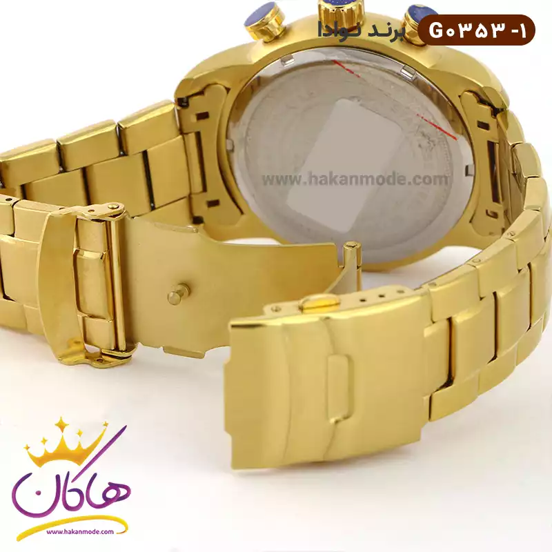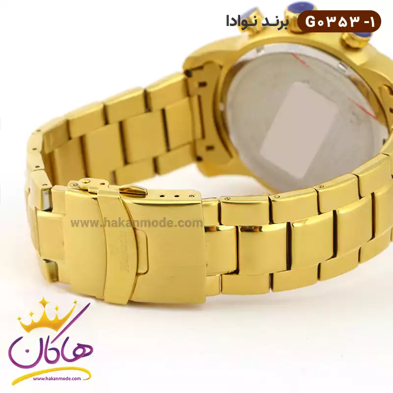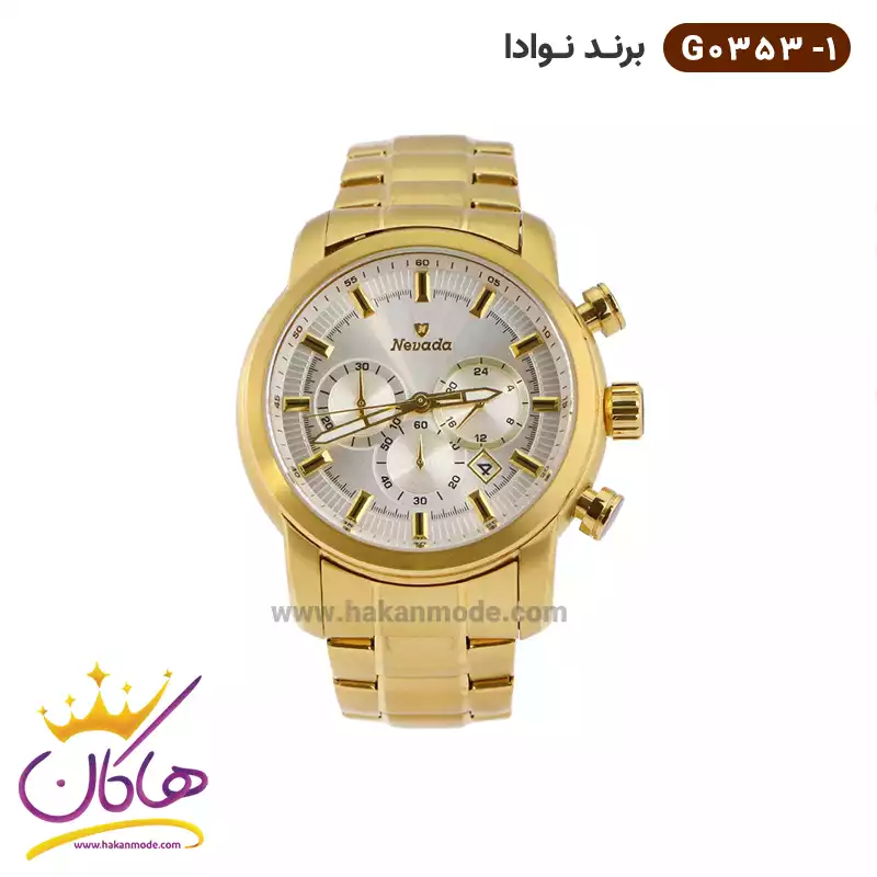 ساعت مچی مردانه نوادا طلایی. این ساعت بند استیل طلایی، بسیار شیک و مجلسی است، گرچه با استایل های اسپرت هم منحصر به فرد و خاص می شود. صفحه گرد و سفید با عقربه و نشانگر طلایی و شب تاب زیبایی بی نظیری ایجاد کرده است. دارای سه موتور فعال کرنوگراف و تقویمی که شما را در تنظیم برنامه هاتان یاری کند. جنس بدنه از استیل ضد حساسیت و شیشه، ضد خش می باشد. قفل این ساعت نوادا از نوع دو طرفۀ دکمه ای است که از محکم ترین و مطمئن ترین قفلهاست. مقاومت در برابر آب تا فشار سه بار یا سی متر هم از دیگر مشخصات بارز ساعت محسوب می‌شود. با این حد مقاومت، در موقعیت‌هایی نظیر بارش باران یا تماس آب با ساعت هنگام شست‌وشوی دست از نفوذ آب به بدنه جلوگیری خواهد شد. همچنین داشتن جعبه مخصوص، نگه داری از ساعت را آسان کرده است.