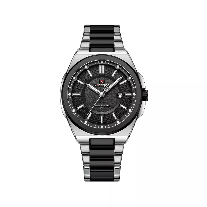 ساعت نیوی فورس مردانه ظاهری کلاسیک و جذاب دارد. این ساعت استیل نقرهای مشکی، رنگ ثابت و ضدحساسیت است. اصلیترین چیزی که در ساعت نیوی فورس مردانه توجه ما را به خود جلب میکند همخوانی رنگ بند با قاب مشکی ساعت است. صفحهی این ساعت مشکی بوده و اندکسهای آن خطی طراحی شدهاند. همچنین عقربههای آن شبنما هستند. زیر ساعت 12 نام برند naviforce دیده میشود. یک دایره کوچک کنار عدد 3 قرار دارد که تقویم ساعت است. در کنار صفحه یک پیچ کوک برای تنظیم زمان وجود دارد. بند ساعت، از بافت یکدست تشکیل شده که قسمت میانی مشکی و کنارههای آن نقرهای است. همچنین جنس بند فلزی و از نوع استیل مرغوب است که باعث تعرق و خارش نمیشود. قفل آن از مدله دوتکه دکمهدار است که از دسته قفلهای محکم و مطمئن است.