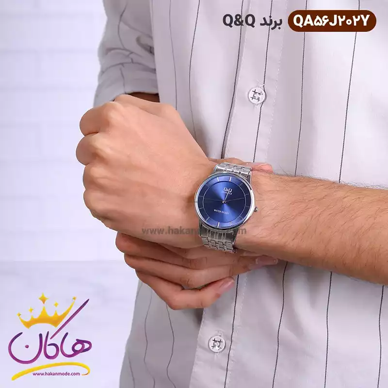 ساعت مچی مردانه کیو اند کیو نقره ای صفحه سورمه ای QA56J202Y نمای روی دست مدل