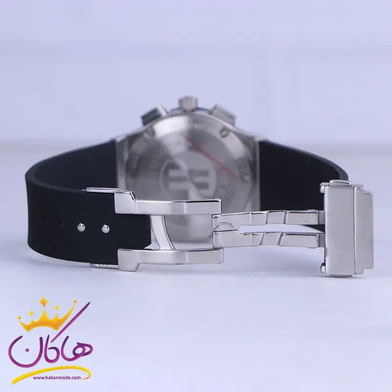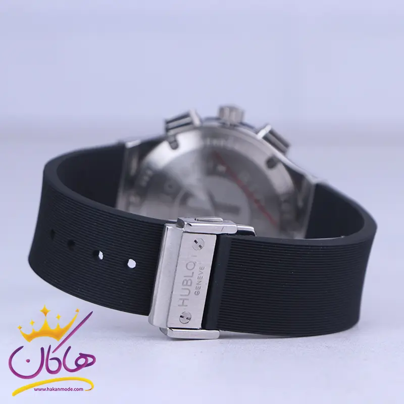 علاوه بر ویژگی های ظاهری اگر به داخل صفحه ساعت نگاه کنید، طراحی ساعت شبیه ساعتهای اتومات است و چرخ دندههای ساعت درون صفحه پیدا هستند. در این ساعت دو صفحه دایرهی کوچک، برای کرنوگراف و دقیقه شمار قرار گرفته است. دایرههای موجود در صفحهی ساعت شما هر کدام نشان دهندهی پارامتری خاص هستند. صفحه سمت چپی برای نشان دادن دقیقه کرنوگراف است و دایره سمت راستی زمان را به صورت 24 ساعته نشان میدهد. اگر از افرادی هستید که امور خود را بر اساس تایم 24 ساعته تنظیم میکنید این صفحه کوچک به کار شما میآید. یک سری عدد با پس زمینهی سفید دور ساعت مشاهده میکنید که همان تقویم ساعت است. هر عددی که در مربع بالای عدد ۶ قرار گرفت آن عدد نشان دهندهی روز ماه است. قاب ساعت به شکل دایره است که دور تا دور آن با پیچهایی تزئین شده است. داشتن اندکسهای خطی نقرهای و عقربههای براق به شما این امکان را میدهد که در شب و محیطهای کم نور هم گذر زمان را ببینید. بند ساعت از جنس رابر مرغوب است که از تعرق و خارش جلوگیری میکند. اگر به درون صفحه دقت کنید، نام برند hublot زیر ساعت 12 دیده میشود. در کنار صفحه سه پین کوک برای تنظیم زمان و کرنوگراف وجود دارد. قفل آن از مدل کلیپسی است که از دسته قفلهای محکم و مطمئن بشمار میرود.