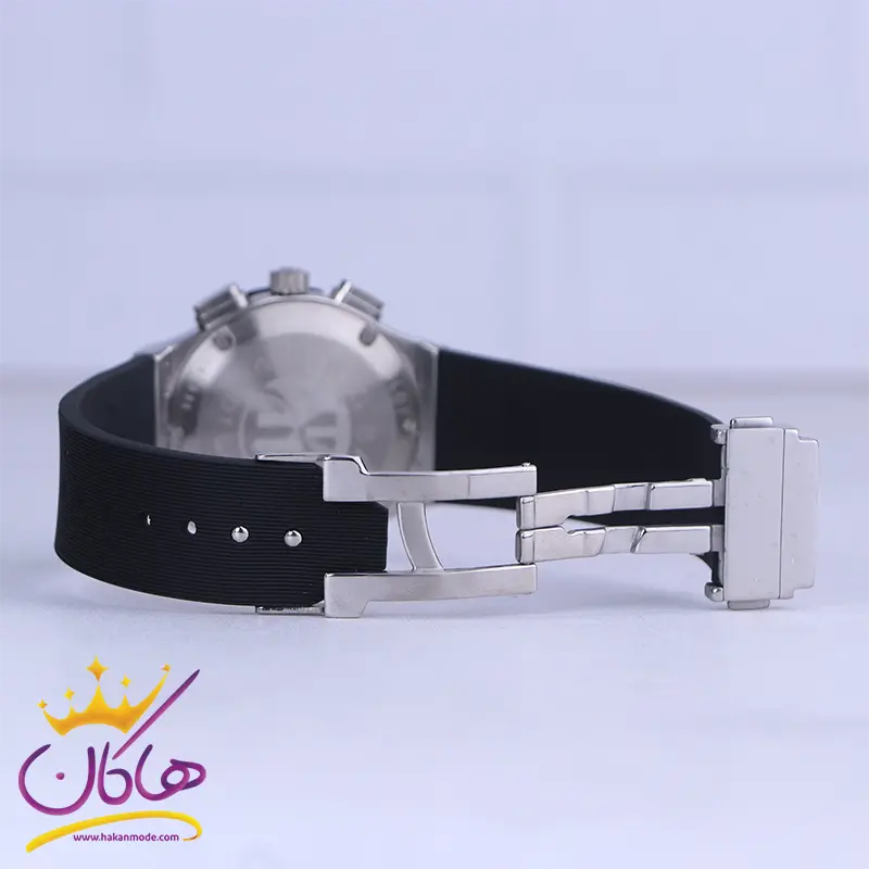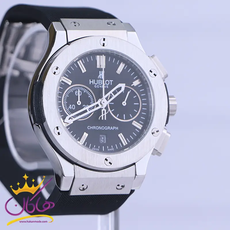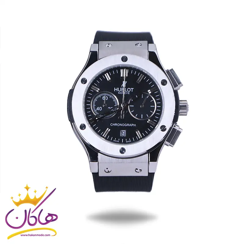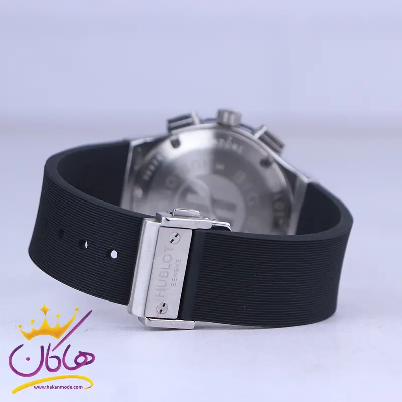 علاوه بر ویژگیهای ظاهری اگر به داخل ساعت نگاه کنید، یک صفحه مشکی ساده مشاهده میکنید. در این ساعت دو صفحه دایرهی کوچک مشکی رنگ، برای کرنوگراف و دقیقه شمار قرار گرفته است. دایرههای موجود در صفحهی ساعت شما هر کدام نشان دهندهی پارامتری خاص هستند. صفحه سمت چپی برای نشان دادن دقیقه و کرنوگراف است و دایره سمت راستی زمان را به صورت 24 ساعته نشان میدهد. اگر از افرادی هستید که امور خود را بر اساس تایم 24 ساعته تنظیم میکنید این صفحه کوچک به کار شما میآید. یک مربع کوچک بالای عدد 6 وجود دارد که نشان دهندهی تقویم ساعت است. قاب ساعت به شکل دایره است که دور تا دور آن با پیچهایی تزئین شده است. داشتن اندکسها و عقربههای خطی نقرهای و براق به شما این امکان را میدهد که در شب و محیطهای کم نور هم گذر زمان را ببینید. بند ساعت از نوع رابر مرغوب و ضد حساسیت است. این بند باعث تعرق و خارش نمیشود. اگر به درون صفحه دقت کنید، نام برند hublot زیر ساعت 12 دیده میشود. در کنار صفحه سه پین کوک برای تنظیم زمان و کرنوگراف وجود دارد. قفل آن از مدل کلیپسی است که از دسته قفلهای محکم و مطمئن بشمار میرود.