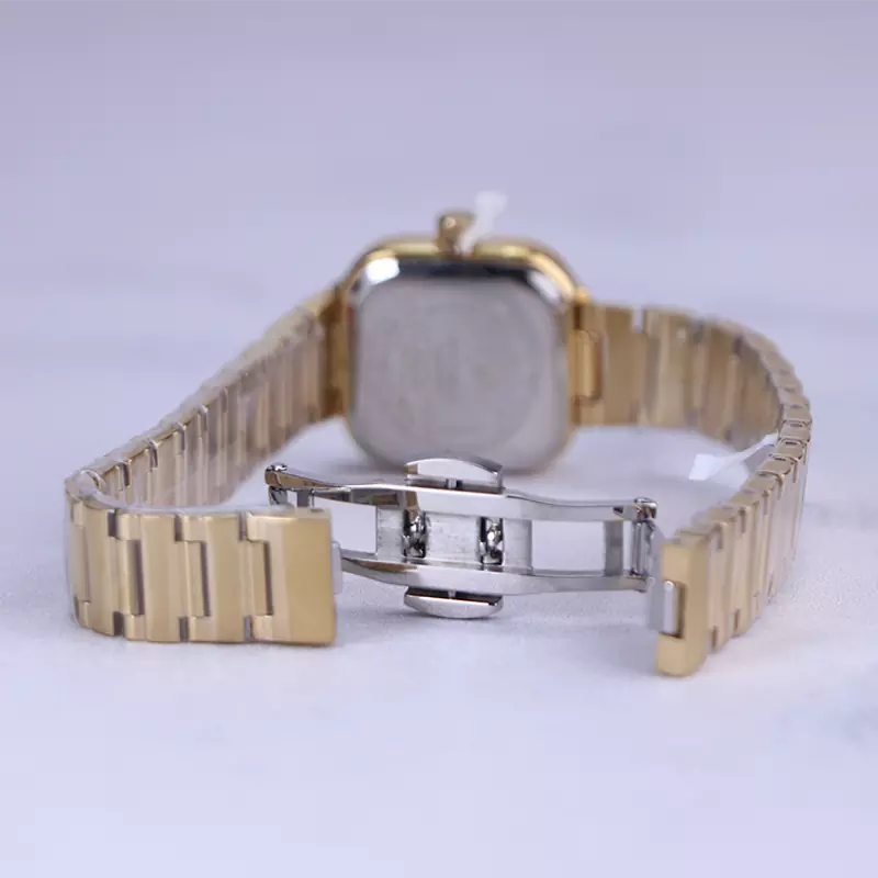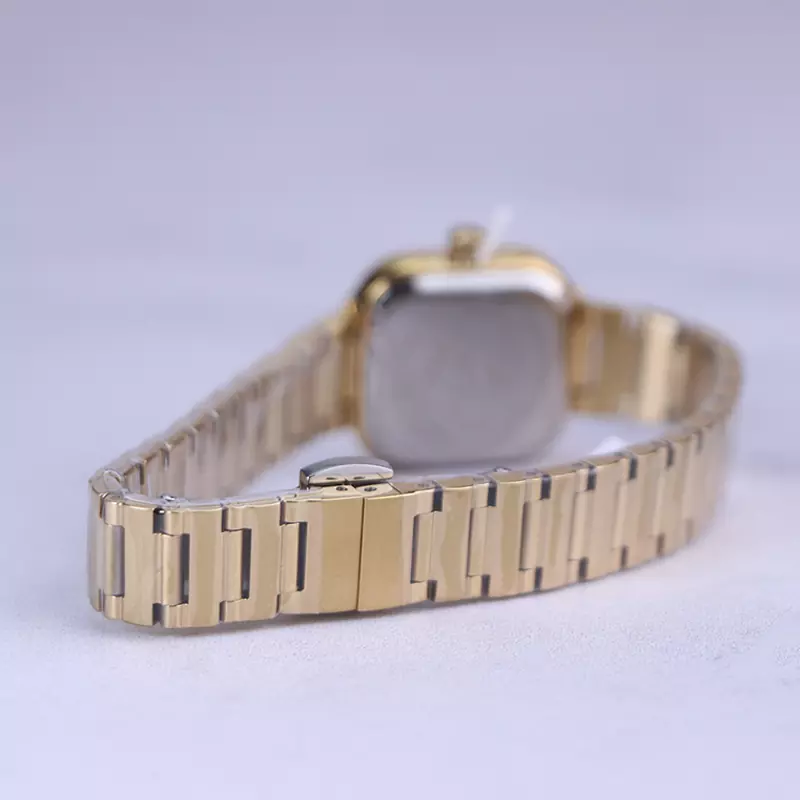 ساعت ویتوریا زنانه فلزی طلایی ظاهری کلاسیک و جذاب دارد. این ساعت عقربهای زنانه شیک استیل، رنگ ثابت و ضدحساسیت است. اصلیترین چیزی که در ساعت زنانه ویتوریا توجه ما را به خود جلب میکند، قاب مربع شکل و صفحهی مشکی رنگ ساعت است. اگر به داخل ساعت نگاه کنید عقربهها و اندکسهای این ساعت خطی و طلایی هستند. نام برند ویتوریا زیر ساعت 12 دیده میشود. در کنار صفحه یک پیچ کوک برای تنظیم زمان وجود دارد. بند ساعت، از بافت یکدست تشکیل شده که طلایی رنگ است. همچنین جنس بند فلزی و از نوع استیل مرغوب است که باعث تعرق و خارش نمیشود. قفل آن از مدل پروانهای دکمهدار است که از دسته قفلهای محکم و مطمئن است.
