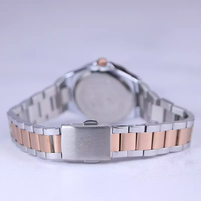 ساعت ویتوریا زنانه فلزی نقرهای رزگلد ظاهری کلاسیک و جذاب دارد. این ساعت عقربهای زنانه شیک استیل، رنگ ثابت و ضدحساسیت است. اصلیترین چیزی که در ساعت زنانه ویتوریا توجه ما را به خود جلب میکند، صفحهی مربع شکل و سفید رنگ ساعت است. اگر به داخل ساعت نگاه کنید اندکسهای این ساعت نگینی و عقربههای آن شبنما هستند. نام برند ویتوریا زیر ساعت 12 دیده میشود. در کنار صفحه یک پیچ کوک برای تنظیم زمان وجود دارد. بند ساعت، از بافت یکدست تشکیل شده که نقرهای بوده و قسمت میانی آن رزگلد رنگ است. همچنین جنس بند فلزی و از نوع استیل مرغوب است که باعث تعرق و خارش نمیشود. قفل آن از مدل دوتکه دکمهدار است که از دسته قفلهای محکم و مطمئن است.