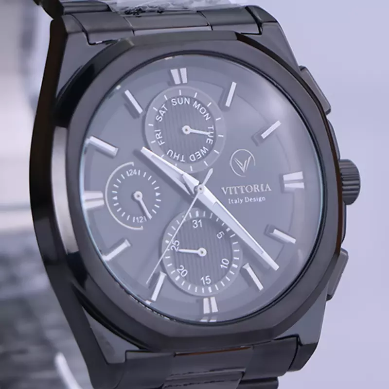 ساعت ویتوریا مردانه فلزی ظاهری مدرن و جذاب دارد. این ساعت استیل مشکی، رنگ ثابت و ضدحساسیت است. اگر به داخل ساعت نگاه کنید، صفحه‌ی این ساعت به رنگ مشکی است و سه صفحه دایره‌ای کوچک می‌بینید که هر کدام از آنها نشان دهنده‌ی پارامتری خاص هستند. یک صفحه که بالا قرار دارد روز‌های هفته را نشان می‌دهد. صفحه‌ی سمت چپ ساعت را به صورت 24 ساعته نشان می‌دهد. اگر از افرادی هستید که امور خود را بر اساس تایم 24 ساعته تنظیم می‌کنید این صفحه کوچک به کار شما می‌آید. صفحه‌ی پایینی، همان تقویم ساعت است. بند ساعت، از بافت ریز و درشت تشکیل شده و از نوع فلز مرغوب است که باعث تعرق و خارش نمی‌شود. اندکس‌های این ساعت به صورت خطی و عقربه‌های آن شبنما طراحی شده‌اند. لوگوی برند ویتوریا را کنار عدد 3 می‌بینید. قفل این ساعت از نوع دوتکه دکمه‌دار است. در کنار صفحه یک پیچ کوک و دو دکمه برای تنظیم زمان وجود دارد.
