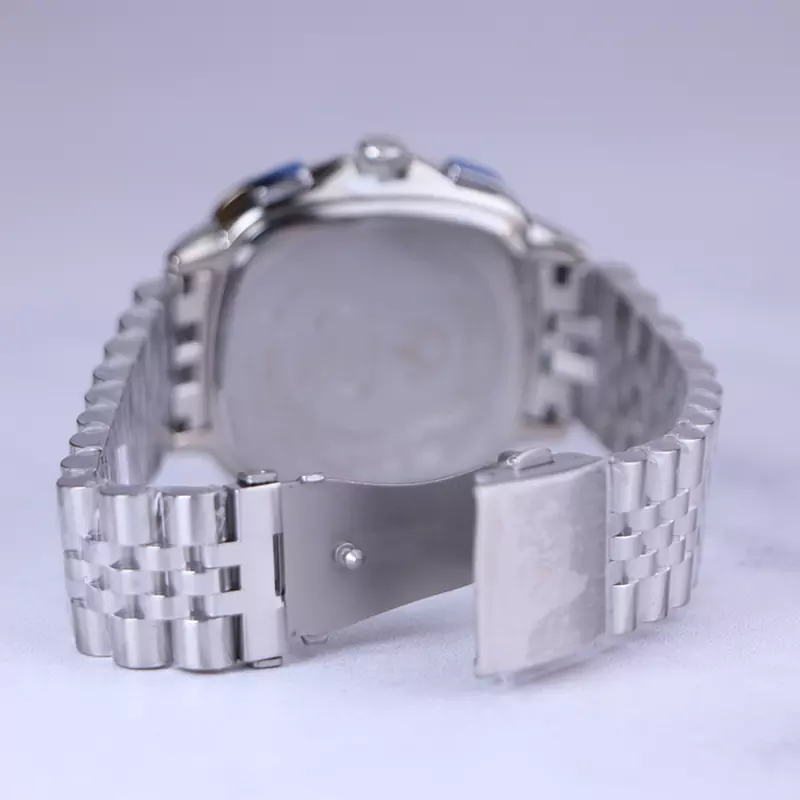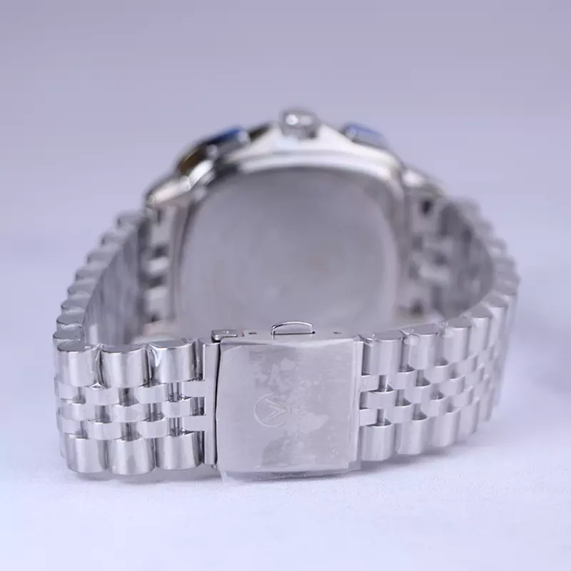 ساعت ویتوریا مردانه فلزی ظاهری مدرن و جذاب دارد. این ساعت استیل نقرهای، رنگ ثابت و ضدحساسیت است. قاب ساعت مربع شکل و نقرهای است. اگر به داخل ساعت نگاه کنید، صفحهی این ساعت به رنگ سبز تیره است و سه صفحه دایرهای کوچک میبینید که هر کدام از آنها نشان دهندهی پارامتری خاص هستند. یک صفحه که بالا قرار دارد روزهای هفته را نشان میدهد. صفحهی سمت چپ ساعت را به صورت 24 ساعته نشان میدهد. اگر از افرادی هستید که امور خود را بر اساس تایم 24 ساعته تنظیم میکنید این صفحه کوچک به کار شما میآید. صفحهی پایینی، همان تقویم ساعت است. بند ساعت، از بافت ریز و درشت تشکیل شده و از نوع فلز مرغوب است که باعث تعرق و خارش نمیشود. اندکسهای این ساعت به صورت خطی و عقربههای آن شبنما طراحی شدهاند. لوگوی برند ویتوریا را کنار عدد 3 میبینید. قفل این ساعت از نوع دوتکه دکمهدار است. در کنار صفحه یک پیچ کوک و دو دکمه برای تنظیم زمان وجود دارد.