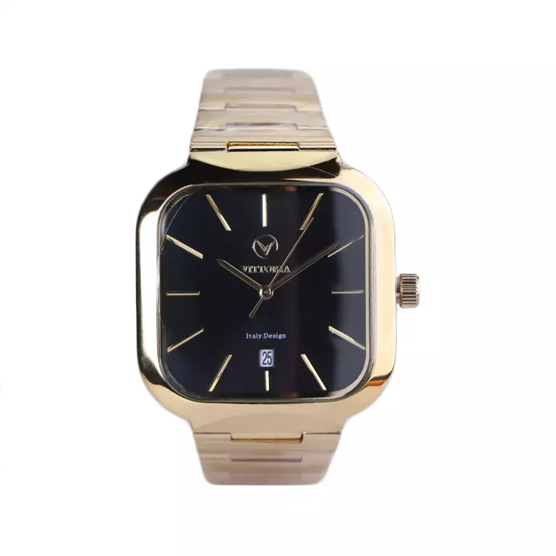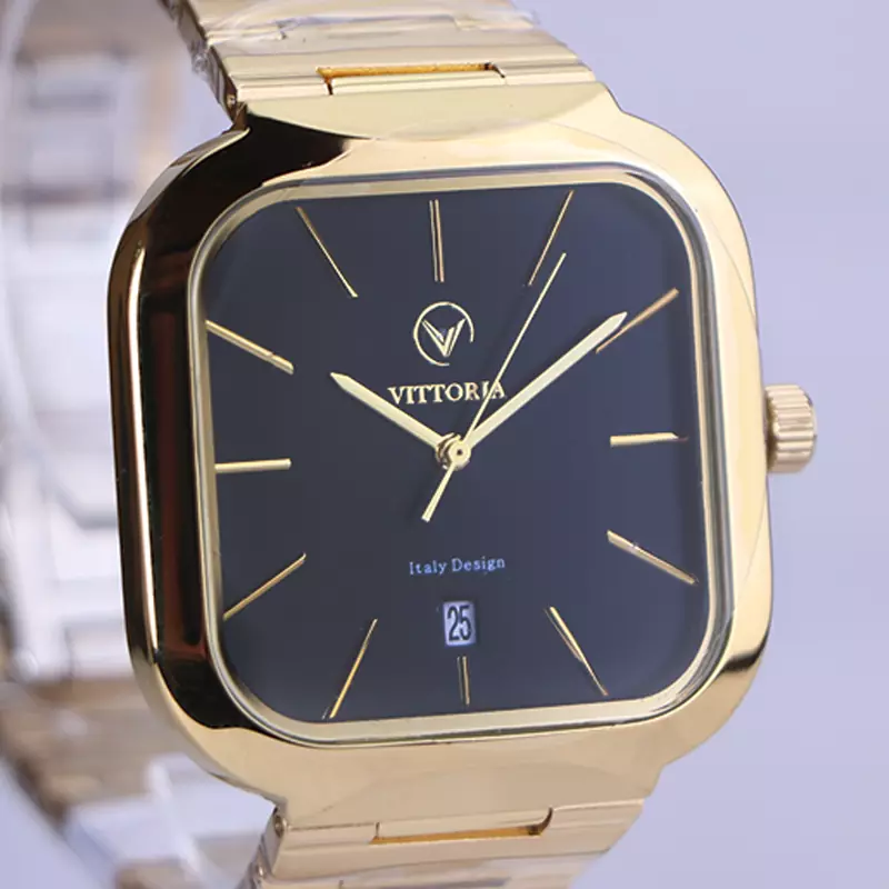 ساعت ویتوریا مردانه ظاهری کلاسیک و جذاب دارد. اصلی‌ترین چیزی که در ساعت مردانه ویتوریا توجه ما را به خود جلب می‌کند، قاب مربع شکل و طلایی رنگ ساعت است. اگر به درون صفحه‌ی مشکی رنگ ساعت نگاه کنید، متوجه می‌شوید که اندکس‌های این ساعت به‌صورت خطی و طلایی طراحی شده‌اند. عقربه‌های آن نیز طلایی هستند. یک مربع کوچک بالای عدد 6 قرار دارد که تقویم ساعت است. نام برند vitoria زیر ساعت 12 دیده می‌شود. در کنار صفحه یک پیچ کوک برای تنظیم زمان وجود دارد. این ساعت بند استیل، رنگ ثابت و ضدحساسیت است. بند ساعت از بافت یکدستی تشکیل شده و طلایی رنگ است. این بند باعث تعرق و خارش نمی‌شود و قفل آن از مدل پروانه‌ای دکمه‌دار است که از دسته قفل‌های محکم و مطمئن است.
