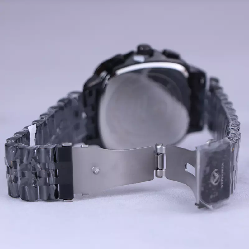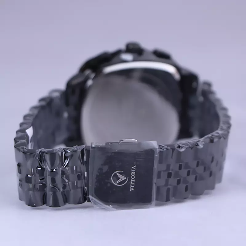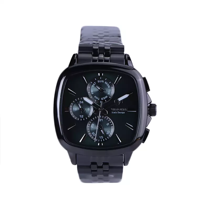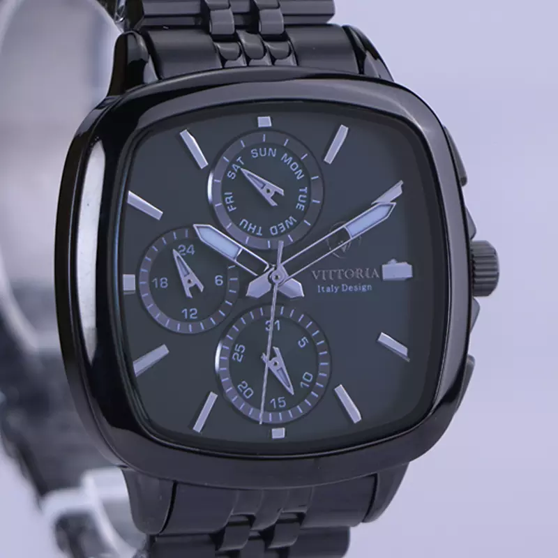ساعت ویتوریا مردانه فلزی ظاهری مدرن و جذاب دارد. این ساعت استیل مشکی، رنگ ثابت و ضدحساسیت است. قاب ساعت مربع شکل و مشکی است. اگر به داخل ساعت نگاه کنید، صفحه‌ی این ساعت به رنگ سبز تیره است و سه صفحه دایره‌ای کوچک می‌بینید که هر کدام از آنها نشان دهنده‌ی پارامتری خاص هستند. یک صفحه که بالا قرار دارد روز‌های هفته را نشان می‌دهد. صفحه‌ی سمت چپ ساعت را به صورت 24 ساعته نشان می‌دهد. اگر از افرادی هستید که امور خود را بر اساس تایم 24 ساعته تنظیم می‌کنید این صفحه کوچک به کار شما می‌آید. صفحه‌ی پایینی، همان تقویم ساعت است. بند ساعت، از بافت ریز و درشت تشکیل شده و از نوع فلز مرغوب است که باعث تعرق و خارش نمی‌شود. اندکس‌های این ساعت به صورت خطی و عقربه‌های آن شبنما طراحی شده‌اند. لوگوی برند ویتوریا را کنار عدد 3 می‌بینید. قفل این ساعت از نوع دوتکه دکمه‌دار است. در کنار صفحه یک پیچ کوک و دو دکمه برای تنظیم زمان وجود دارد.