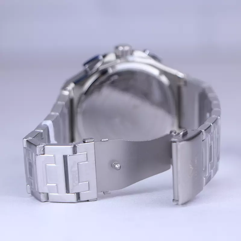 ساعت ویتوریا مردانه فلزی ظاهری مدرن و جذاب دارد. این ساعت استیل نقرهای، رنگ ثابت و ضدحساسیت است. قاب ساعت چندضلعی و نقرهای است. اگر به داخل ساعت نگاه کنید، صفحهی این ساعت به رنگ مشکی است و سه صفحه دایرهای میبینید که هر کدام از آنها نشان دهندهی پارامتری خاص هستند. یک صفحه که بالا قرار دارد روزهای هفته را نشان میدهد. صفحهی سمت چپ ساعت را به صورت 24 ساعته نشان میدهد. اگر از افرادی هستید که امور خود را بر اساس تایم 24 ساعته تنظیم میکنید این صفحه کوچک به کار شما میآید. صفحهی پایینی، همان تقویم ساعت است. بند ساعت، از بافت ریز و درشت تشکیل شده و از نوع فلز مرغوب است که باعث تعرق و خارش نمیشود. اندکسهای این ساعت به صورت خطی و عقربههای آن نقرهای طراحی شدهاند. لوگوی برند ویتوریا را کنار عدد 3 میبینید. قفل این ساعت از نوع دوتکه دکمهدار است. در کنار صفحه یک پیچ کوک و دو دکمه برای تنظیم زمان وجود دارد.