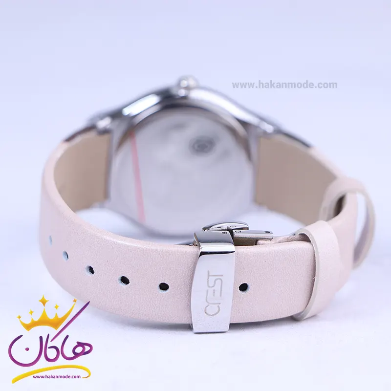 ساعت مچی کرست زنانه بند چرم کرم ظاهری کلاسیک و جذاب دارد. قاب این ساعت به رنگ استیل رزگلد/نقرهای، رنگ ثابت و ضدحساسیت است. اصلیترین چیزی که در ساعت عقربهای زنانه کرست توجه ما را به خود جلب میکند، صفحه شایندار ساعت است که بر زیبایی و شیکی آن افزوده است. اگر به درون صفحه نگاه کنید، این ساعت بدون اندکس است، فقط 4 اندکس اصلی یعنی 3و6و9و12 به صورت نگینی کوچک طراحی شدهاند. نام برند crest زیر ساعت 12 دیده میشود. در کنار صفحه یک پیچ کوک برای تنظیم زمان وجود دارد. بند ساعت از نوع چرم مرغوب که پوسته پوسته و بریده نمیشود. این بند باعث تعرق و خارش نمیشود و قفل آن از مدل سگکی(کمربندی) است که از دسته قفلهای محکم و مطمئن است.