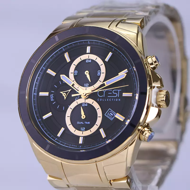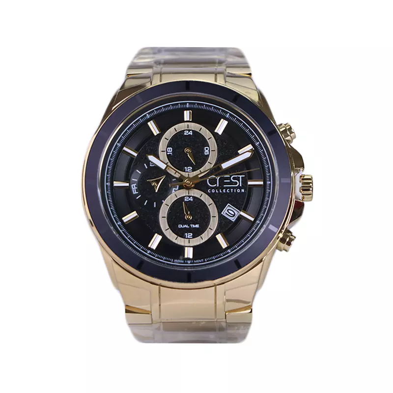 ساعت عقربه ای کرست مردانه فلزی ظاهری مدرن و جذاب دارد. این ساعت بند استیل طلایی، رنگ ثابت و ضدحساسیت است. اصلیترین چیزی که در ساعت مردانه کرست توجه ما را به خود جلب میکند، سه صفحه دایرهای کوچک است، که درون صفحه هستند. دایرههای موجود در صفحهی مشکی رنگ این ساعت، هر کدام نشان دهندهی پارامتری خاص هستند. یک صفحه ساعت را به صورت ۲۴ ساعت نشان میدهد. گزینه بعدی روزهای هفته را نشان میدهد. دایرهی بعدی نشان دهندهی ساعت جهانی است. در سمت راست یک مربع کوچک وجود دارد که نشانگر روزهای ماه بوده و همان تقویم ساعت نیز است. عقربهها طلایی، شبنما و اندکسها خطی و شبنما هستند. ثانیه شمار این ساعت طلایی رنگ طراحی شده است. اگر به درون صفحه نگاه کنید، نام برند crest کنار ساعت 3 دیده میشود. در کنار صفحه یک پیچ کوک و دو دکمه برای تنظیم زمان وجود دارد. بند ساعت، فلزی و از نوع استیل مرغوب است که باعث تعرق و خارش نمیشود. طرح این بند از یک بافت یکدست تشکیل شده است و قفل آن از مدل دوتکه قفلدار است که از دسته قفلهای محکم و مطمئن است.