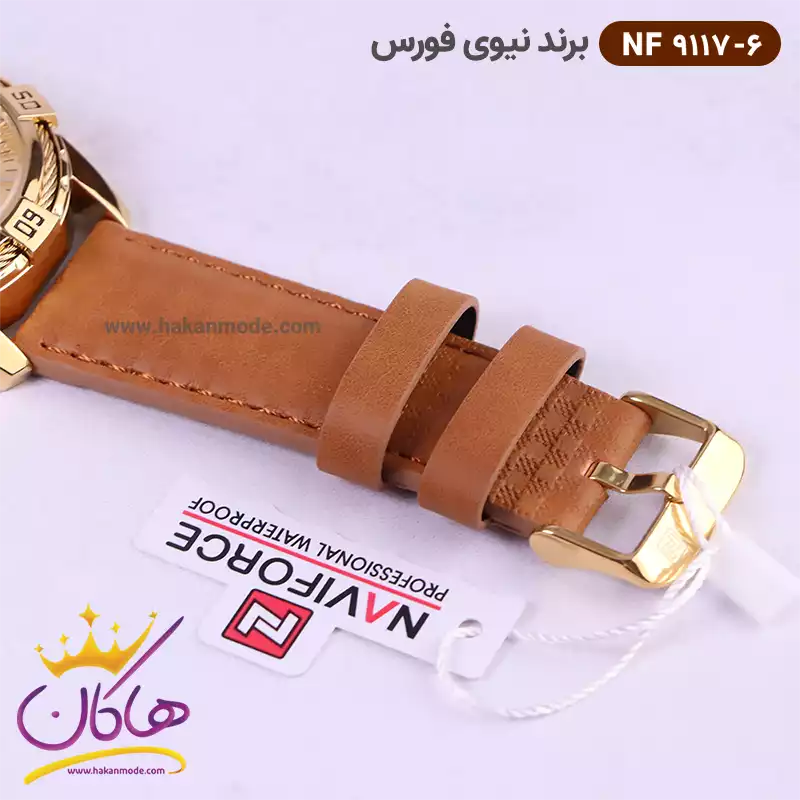 ویژگی ساعت نیوی فورس مردانه بند چرمی صفحه طلایی کد 9117/6