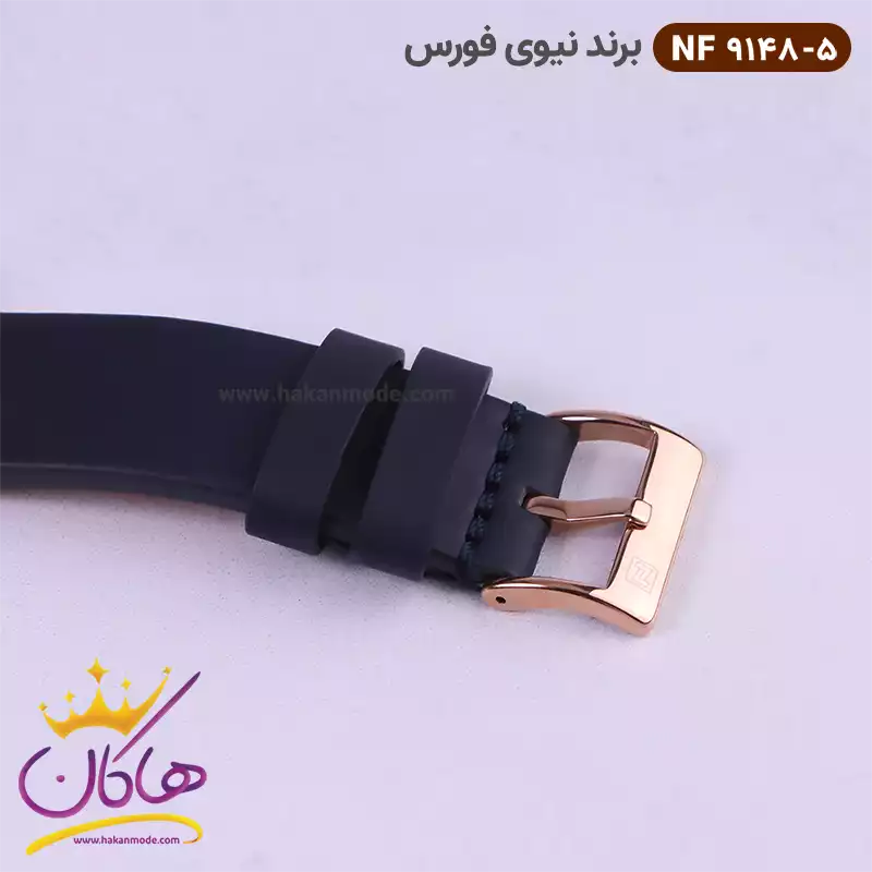 ساعت نیوی فورس مردانه بند چرمی 9148/5 ظاهری مدرن و جذاب دارد. قاب این ساعت استیل رزگلد، رنگ ثابت و ضدحساسیت است. اگر به داخل ساعت نگاه کنید، صفحهی این ساعت به رنگ آبی است و سه صفحه دایرهای کوچک میبینید که هر کدام از آنها نشان دهندهی پارامتری خاص هستند. یک صفحه که بالا قرار دارد روزهای هفته را نشان میدهد. صفحهی سمت چپ، ساعت را به صورت 24 ساعته نشان میدهد. اگر از افرادی هستید که امور خود را بر اساس تایم 24 ساعته تنظیم میکنید این صفحه کوچک به کار شما میآید. صفحهی پایینی، نشاندهندهی روزهای ماه است. بند ساعت از نوع چرم مرغوب و ضد حساسیت است. این بند سورمهای رنگ بوده و باعث تعرق و خارش نمیشود. اندکسهای این ساعت به صورت خطی رزگلد و عقربههای آن شبنما طراحی شدهاند. لوگوی برند نیوی فورس را کنار عدد ۳ میبینید. در کنار صفحه یک پیچ کوک و دو دکمه برای تنظیم زمان وجود دارد. قفل این ساعت از نوع سگکی (کمربندی) است که از دسته قفلهای محکم و مطمئن به شمار میرود.