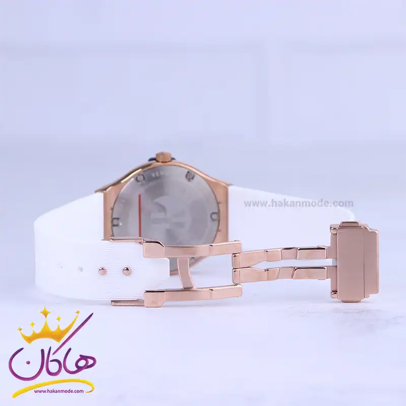 ساعت هابلوت زنانه بند رابر سفید قاب رزگلد L 460/11 نمای باز قفل